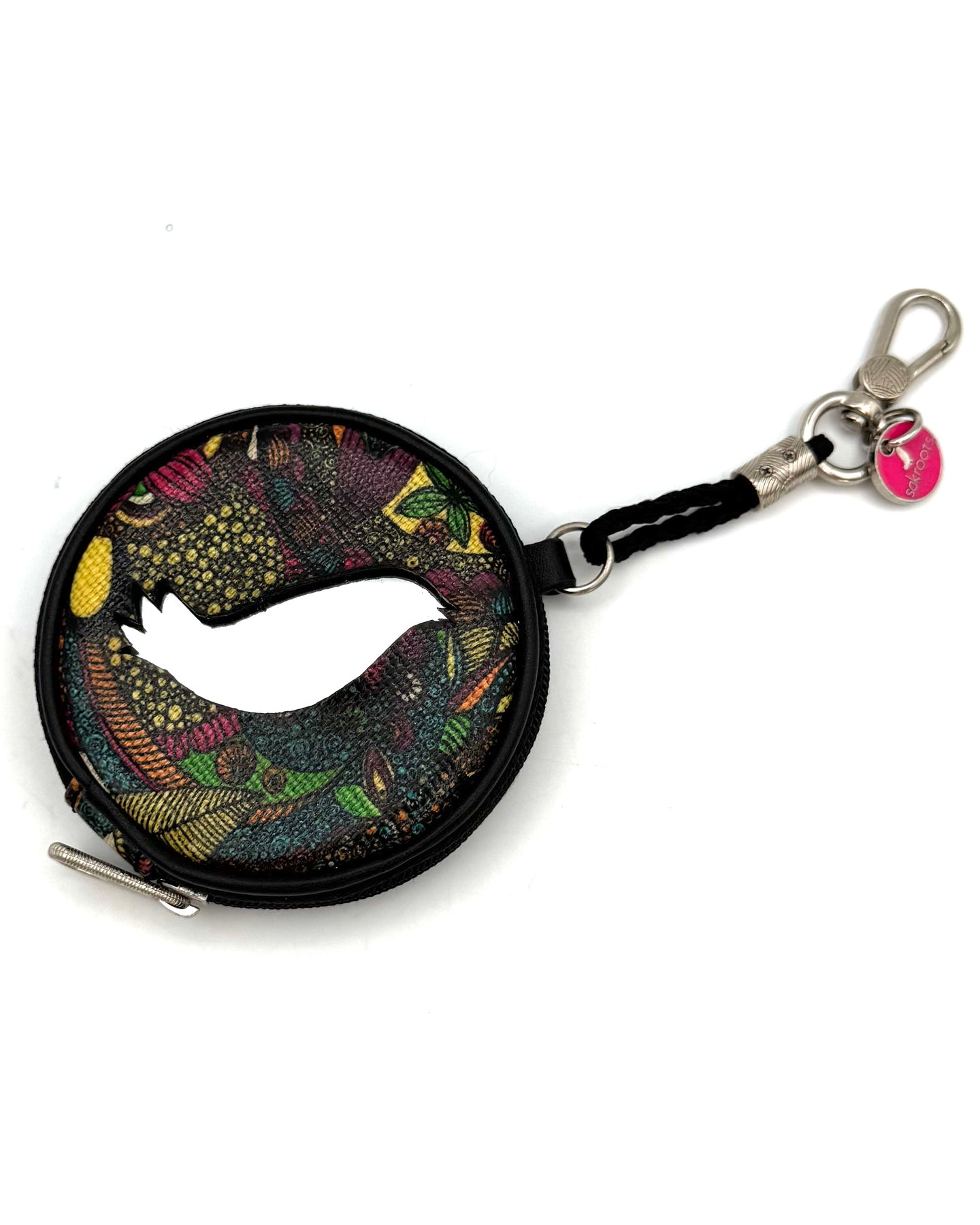 The Sak multicolor circular zippered keychain with bird mirror design on front and attachable silver keychain