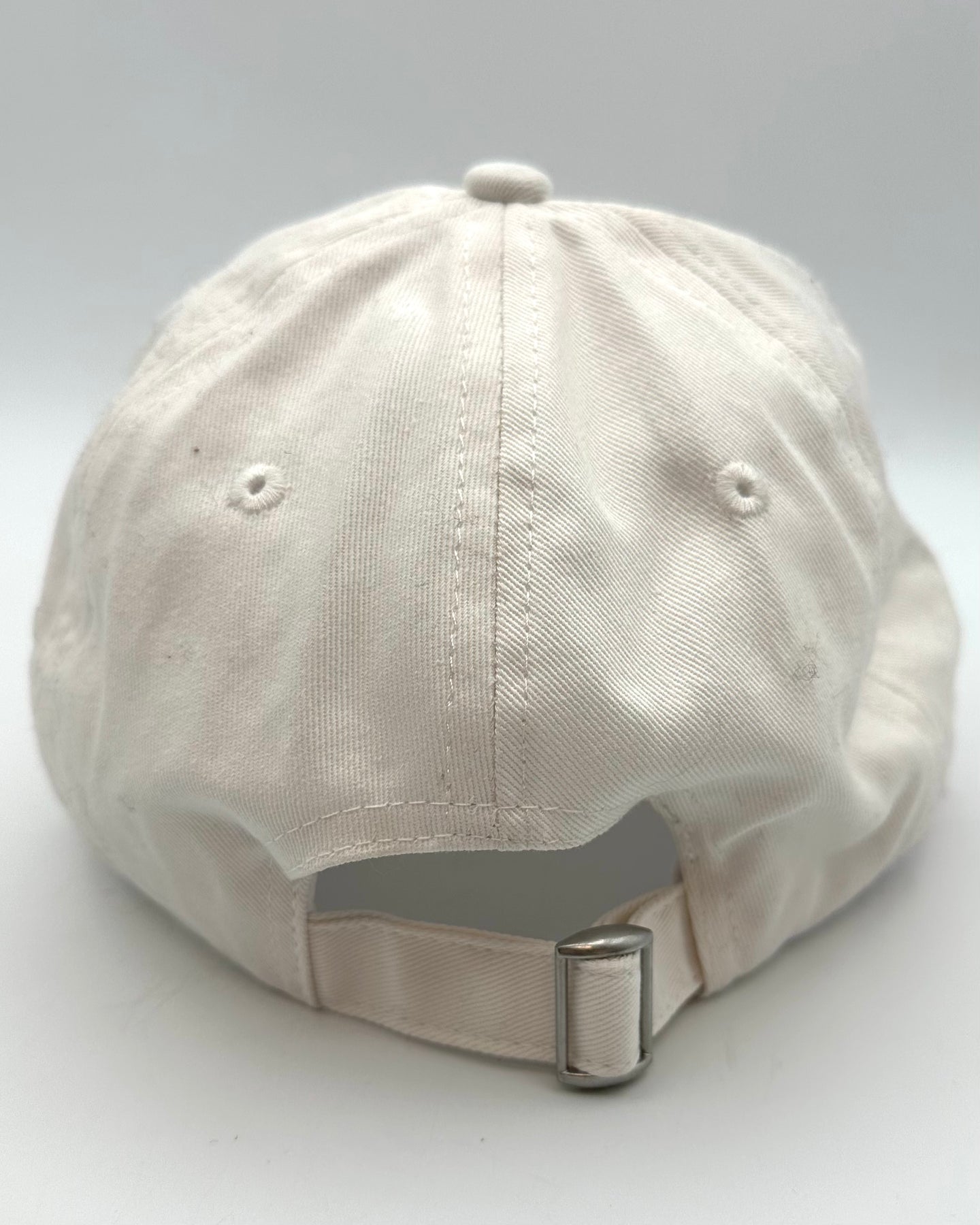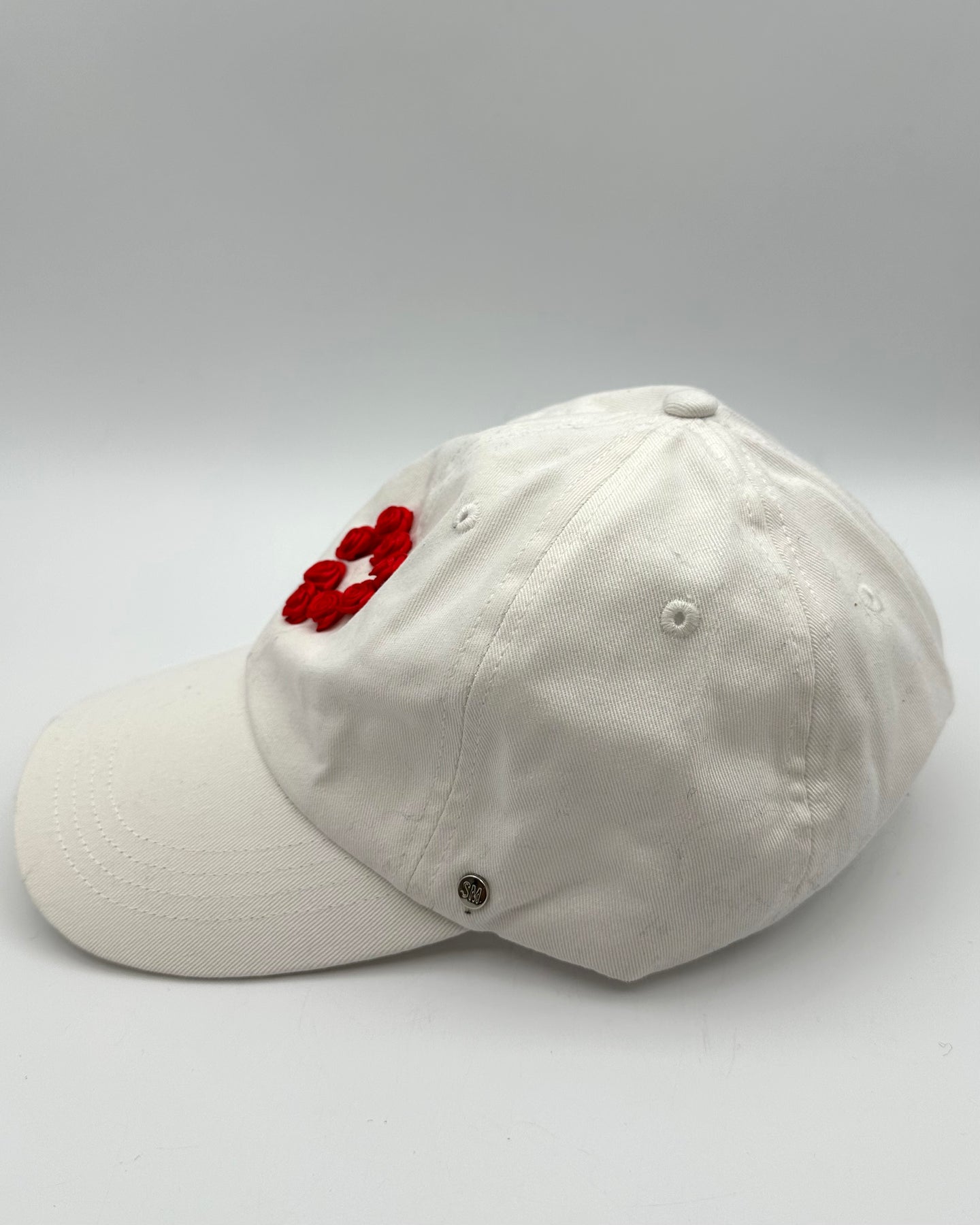 Steve Madden baseball cap with silver hardware adjuster, curved brim, small heart-shaped roses on the front center in a white, breathable baseball cap.