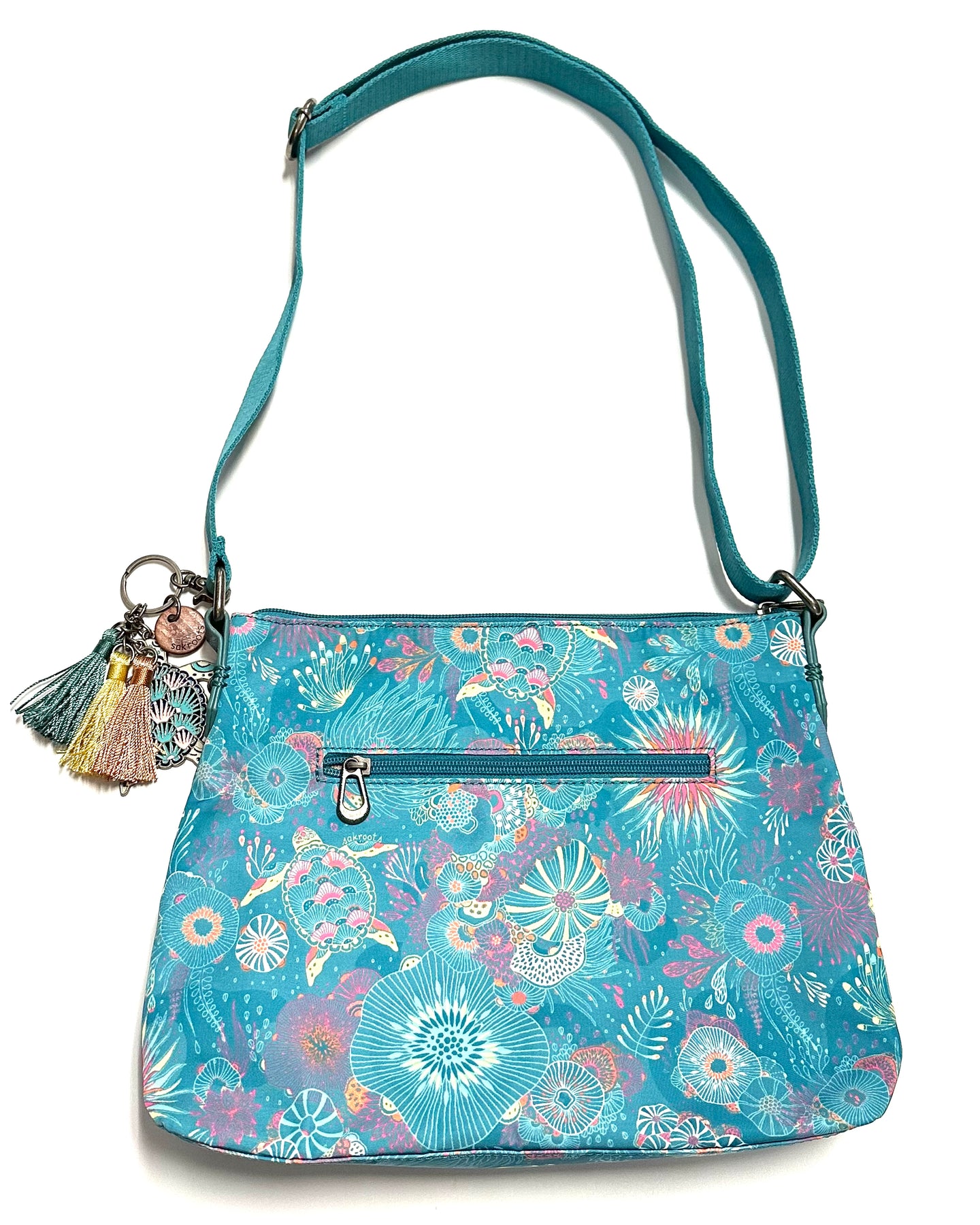 The Sak teal ocean motif print crossbody bag with adjustable teal fabric strap, main compartment zipper closure, two non zipper interior pockets, zipper interior pocket, two front exterior zipper pockets, back exterior zipper pocket and removable turtle and pink, yellow and teal tassel keychain