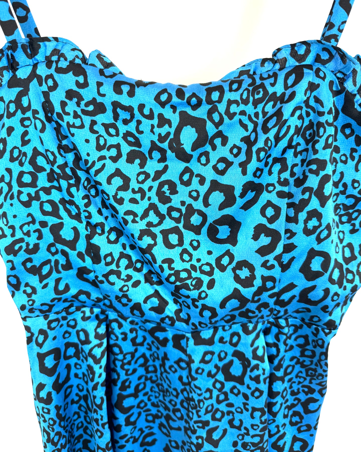 Aqua bright blue romper with black leopard print, smocked back, and adjustable thin straps