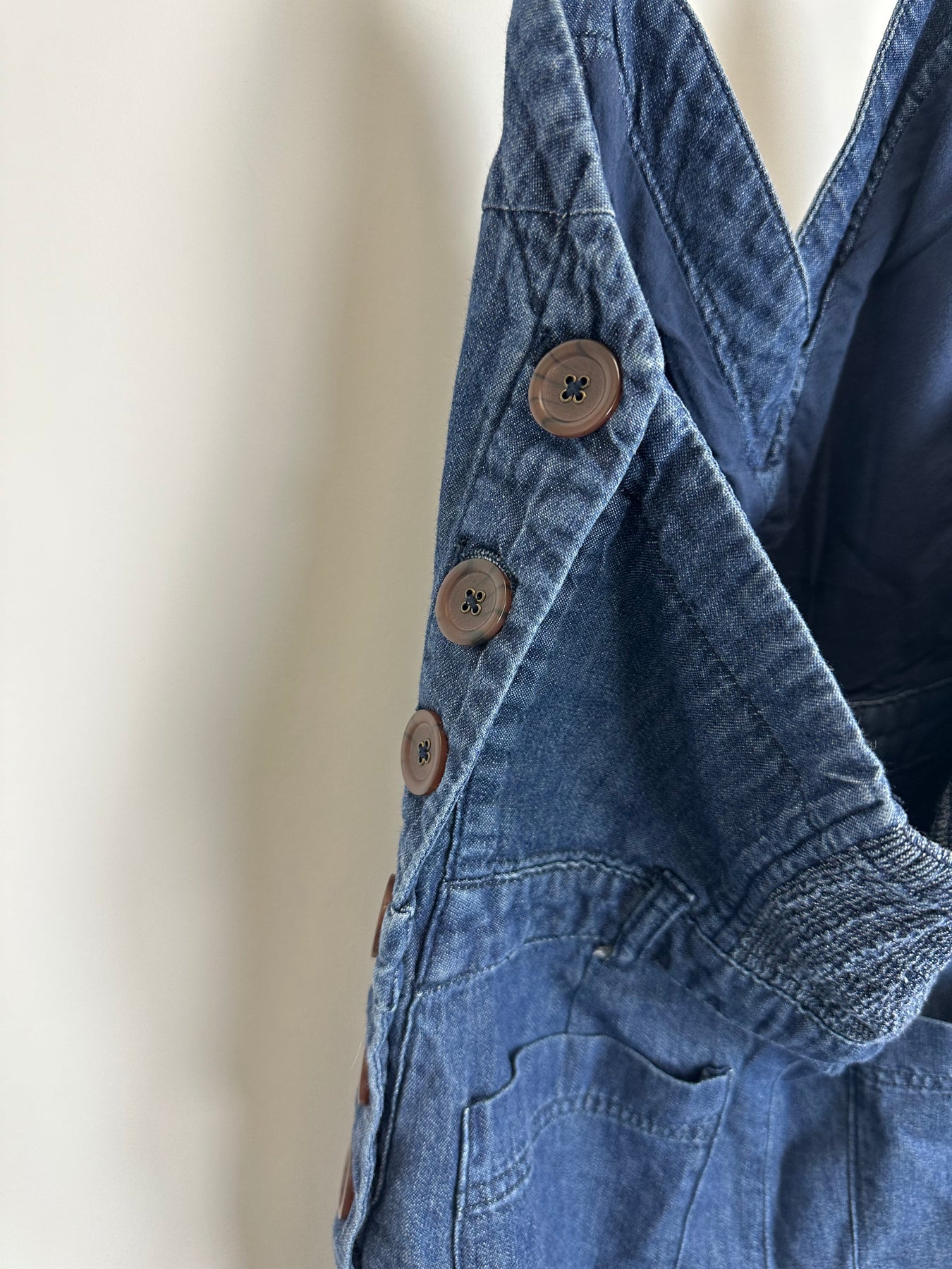 Cooperative blue denim jumpsuit with a v-neckline, tie halter neck, side buttons, belt loops, front and back pockets, smocked back and wide pant legs