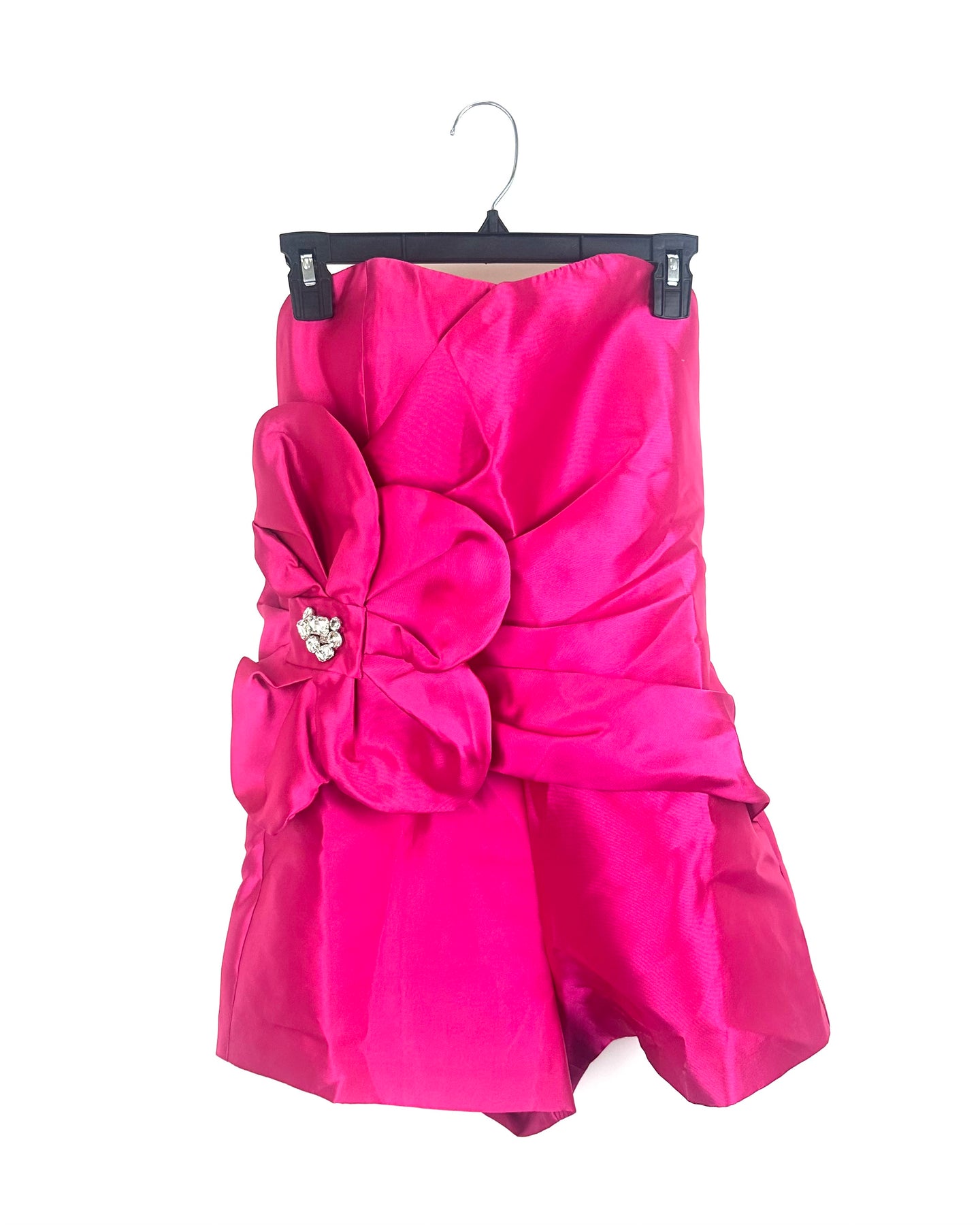 Hutch hot pink romper with strapless top, large flower at waist with rhinestone embellishment, satin like material and hidden zipper closure in back