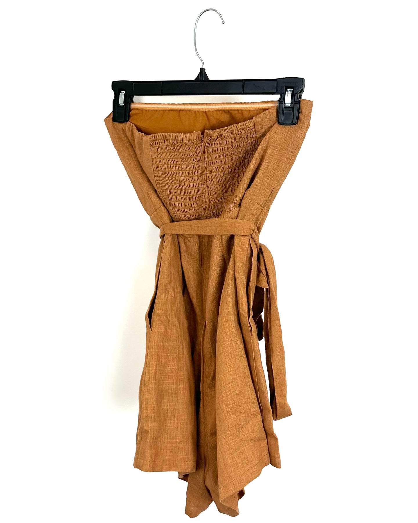 Petal and Pup sienna orange romper, lightweight woven material fabric, sleeveless style with square neckline and inner grip piping, ruched back bodice with zipper and hook-and-eye closure, wide leg shorts with side pockets and adjustable removable matching waist belt