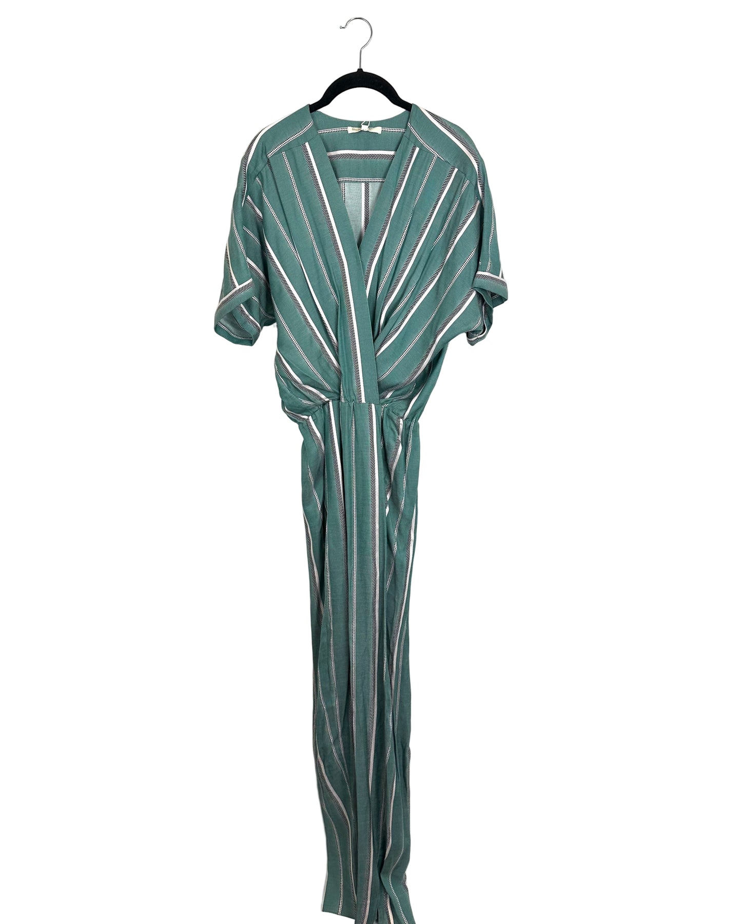 Maje sage green jumpsuit, lightweight woven material fabric with black and white stripe pattern, v neckline and short sleeves, with elastic waistband, side pockets and straight leg bottoms