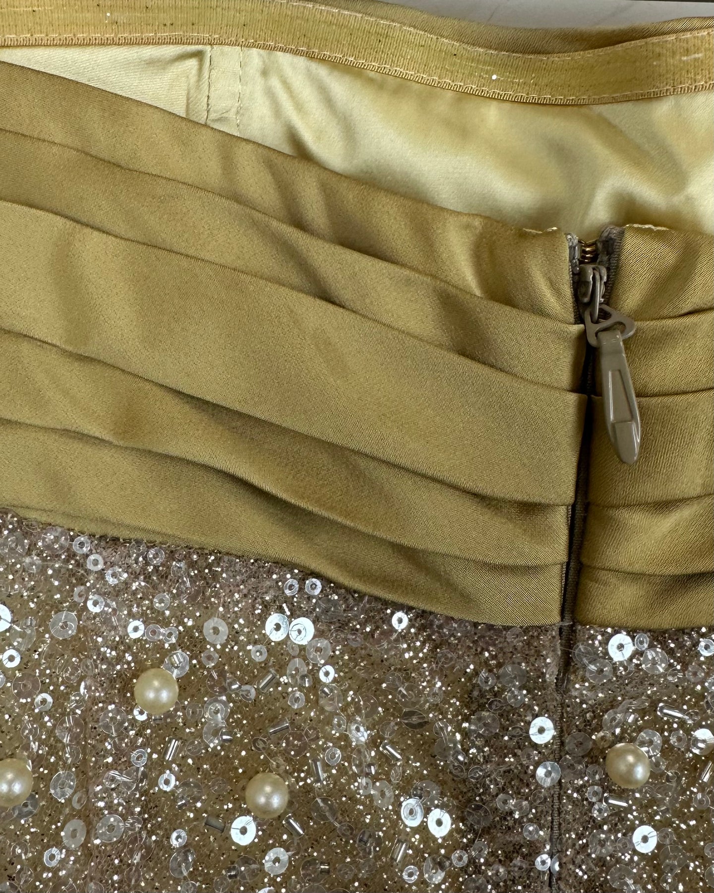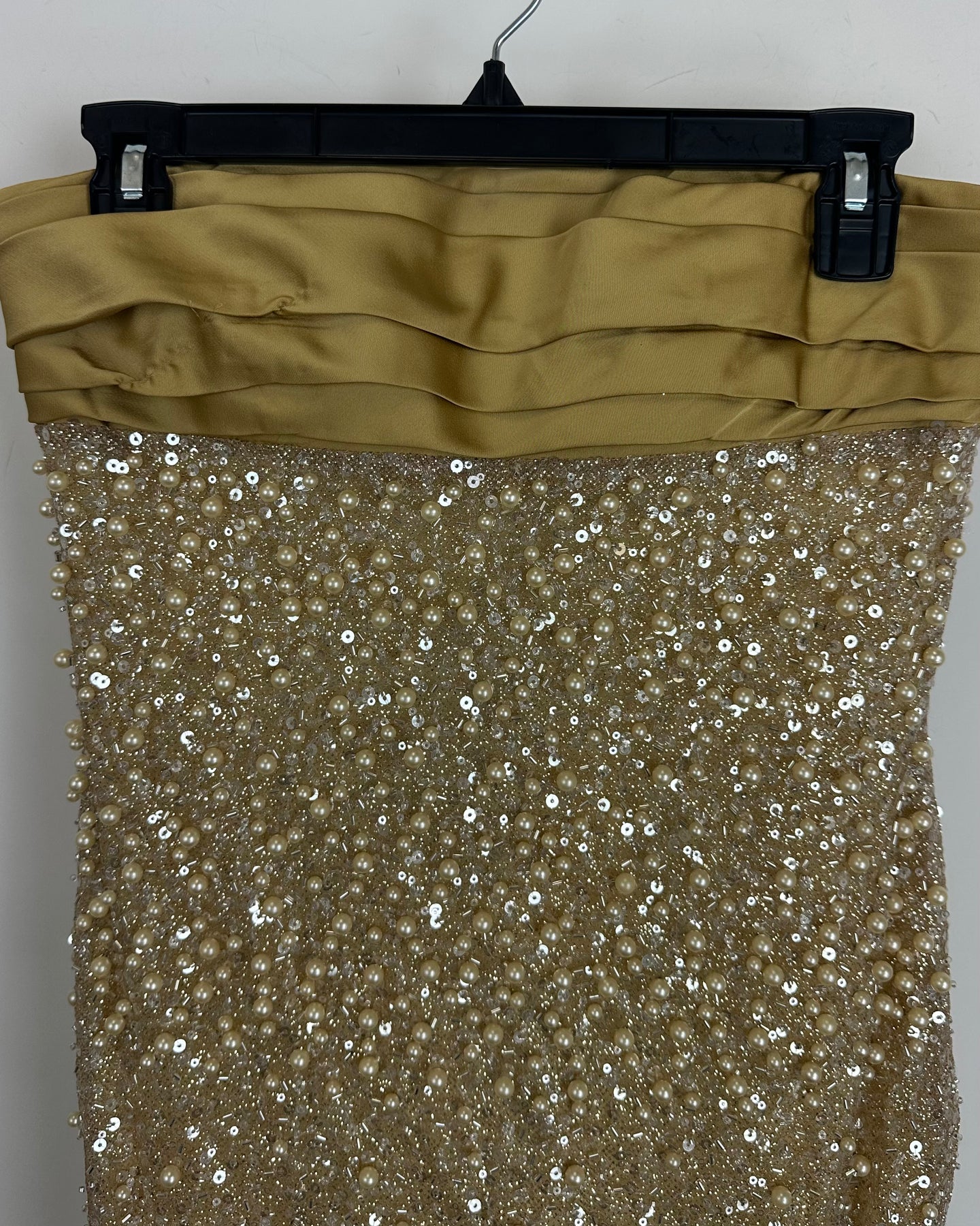 Miss Circle gold strapless gown in a bodycon silhouette with built in cups, small slit in the back, fully lined, sequin, glitter & pearl beaded detail, back zipper and satin neckline. Please note slight fabric pull on neckline.