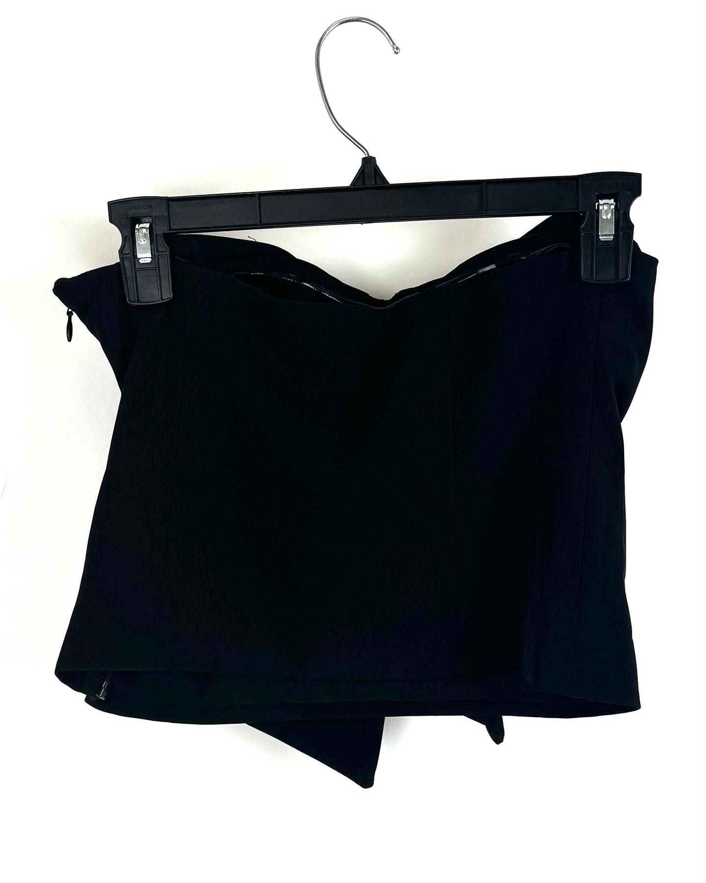 NBD black strapless top with underwire cups, a bow accent in the front, a hidden side zipper, non-slip grip lining