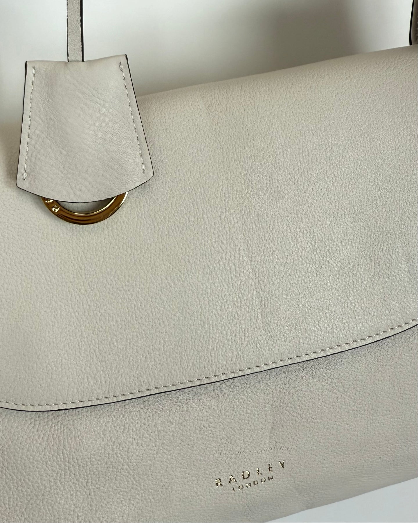 Radley London ivory shoulder bag, leather material with magnetic closure, fully lined interior with inner pocket and zipper pocket, with knotted shoulder strap