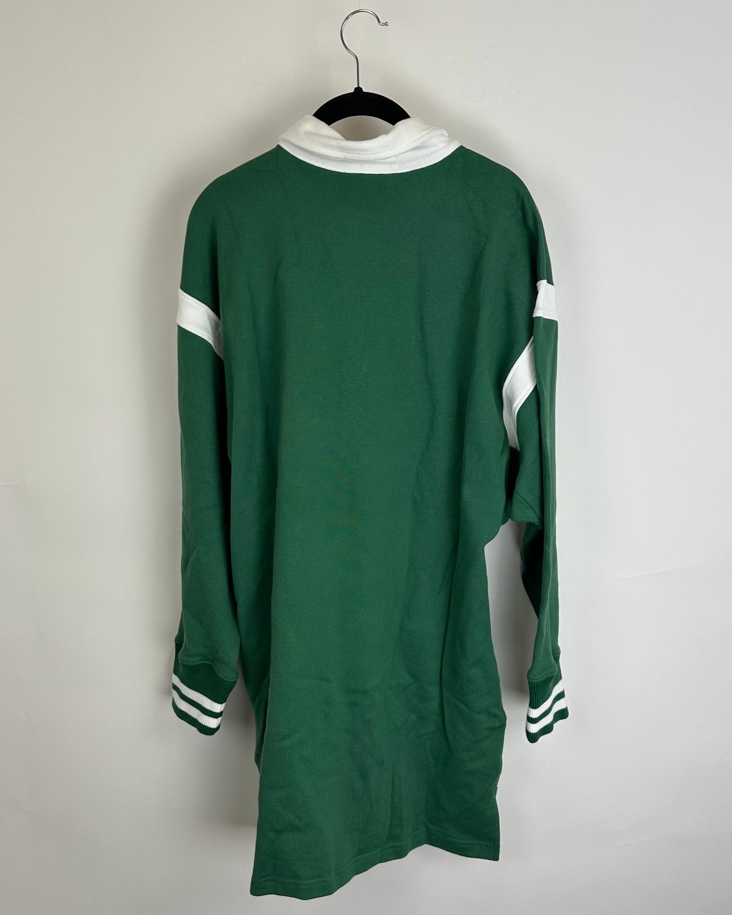 Rowing Blazers rugby, heavy knit dress with green and white, long sleeves, pockets, collar and button neckline