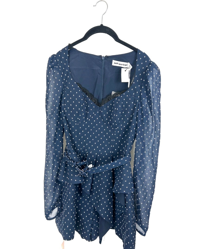Self-Portrait navy romper with white polka dot design throughout, long mesh sleeves with buttons at wrist, underwire cup tops with black lace at top, belt loops with removable belt at waist, ruffle skirt bottom with built in shorts, and back hidden zipper closure