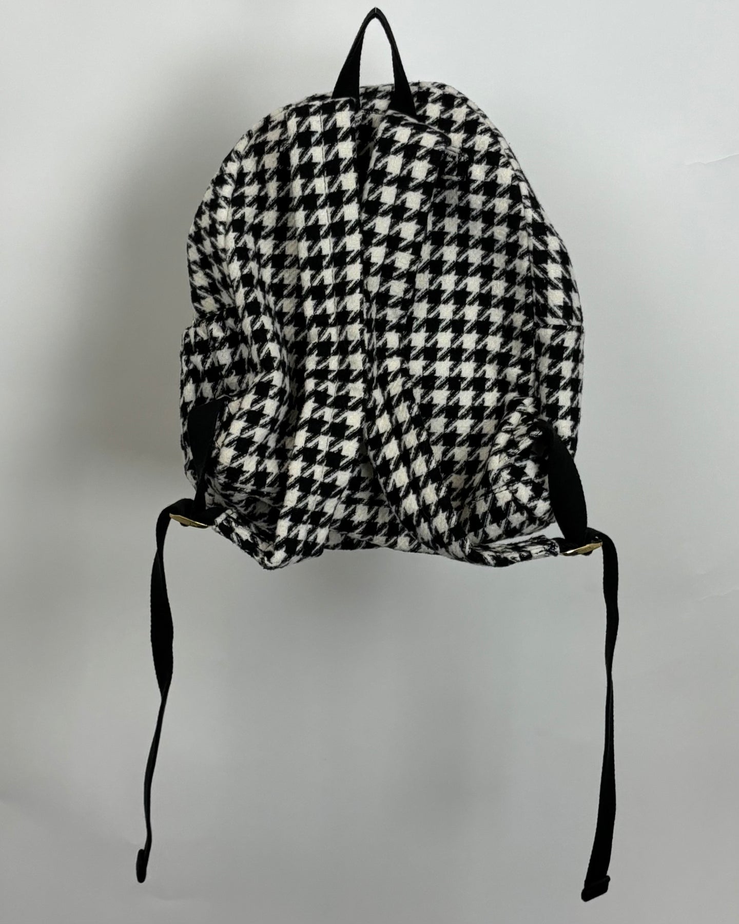 Stoney Clover Lane black and white houndstooth mini backpack in a fuzzy fabric with adjustable straps, front zipper pocket, main zipper compartment and gold hardware