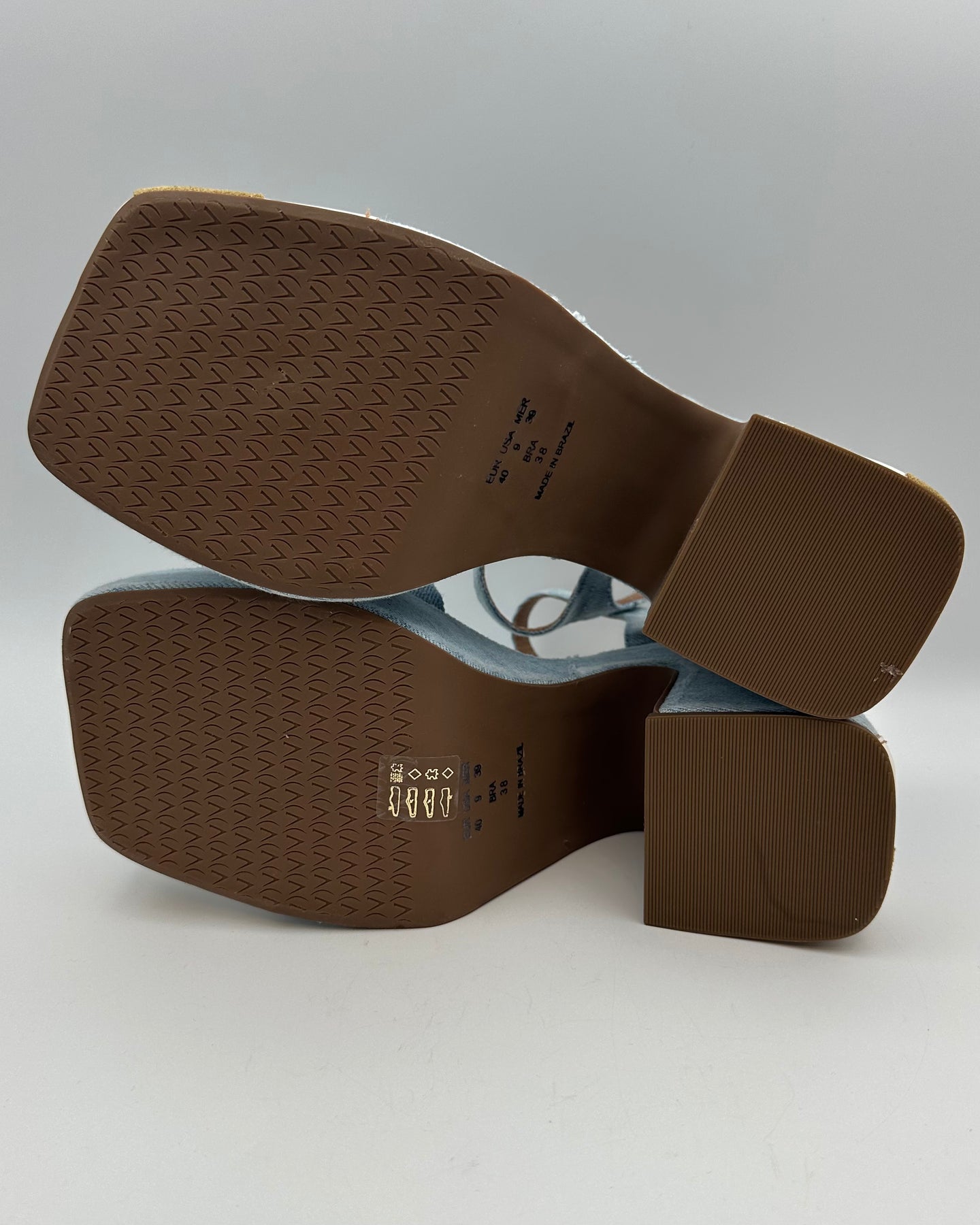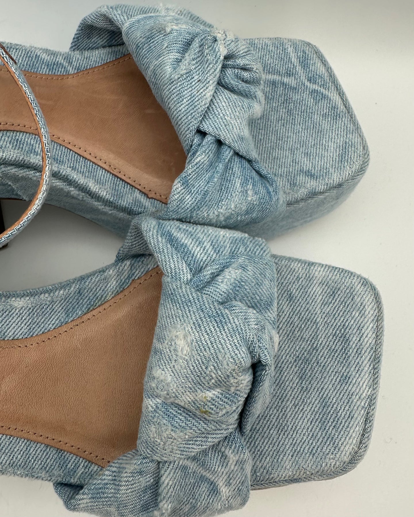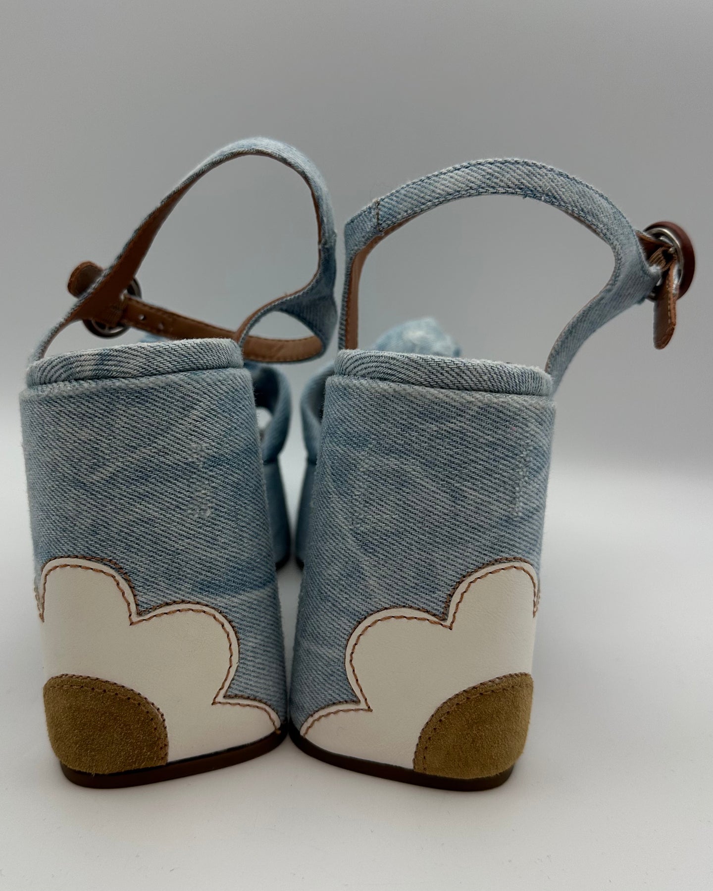 Vicenza blue denim platform sandals with leather and suede white flower details, open square toe and ankle strap