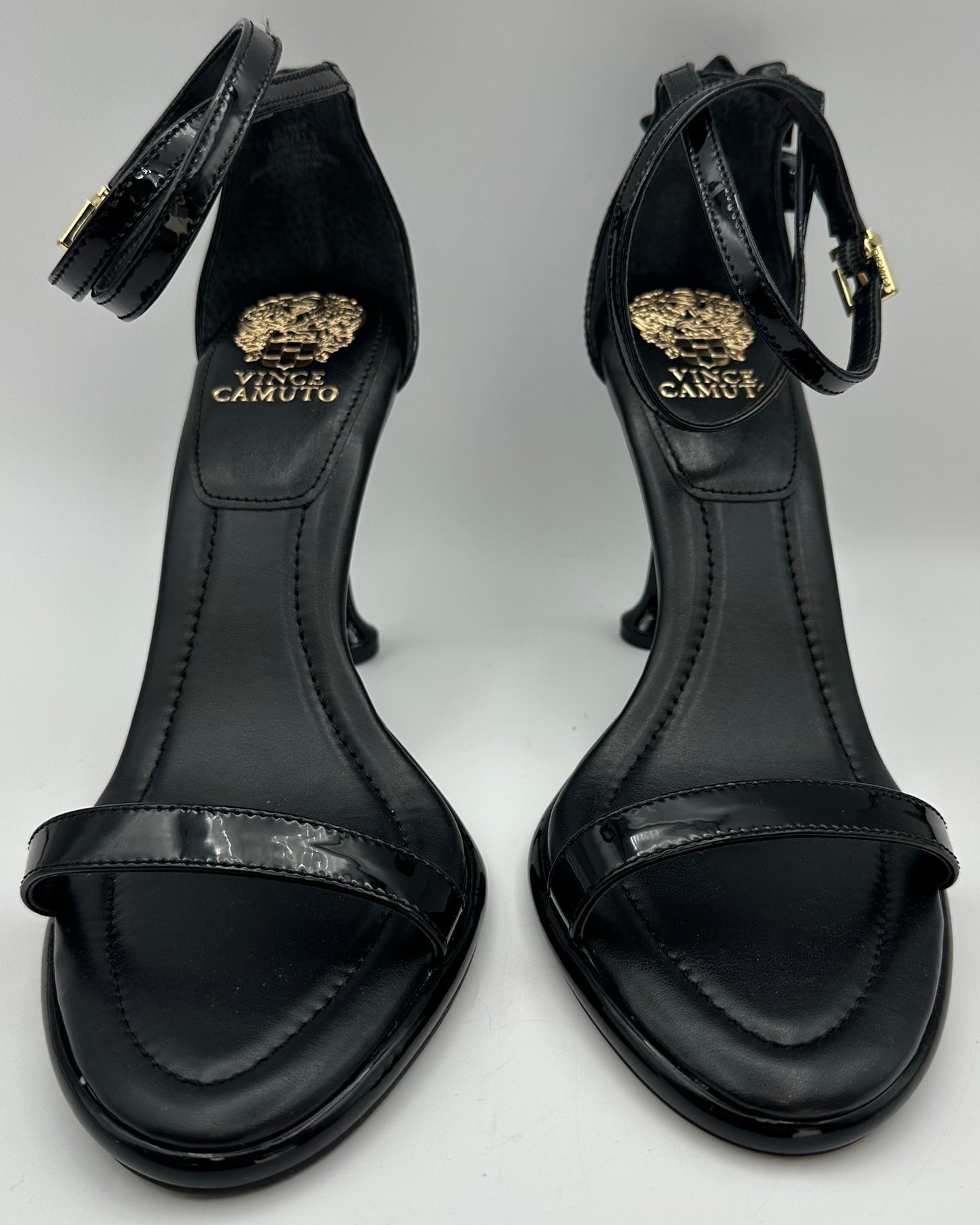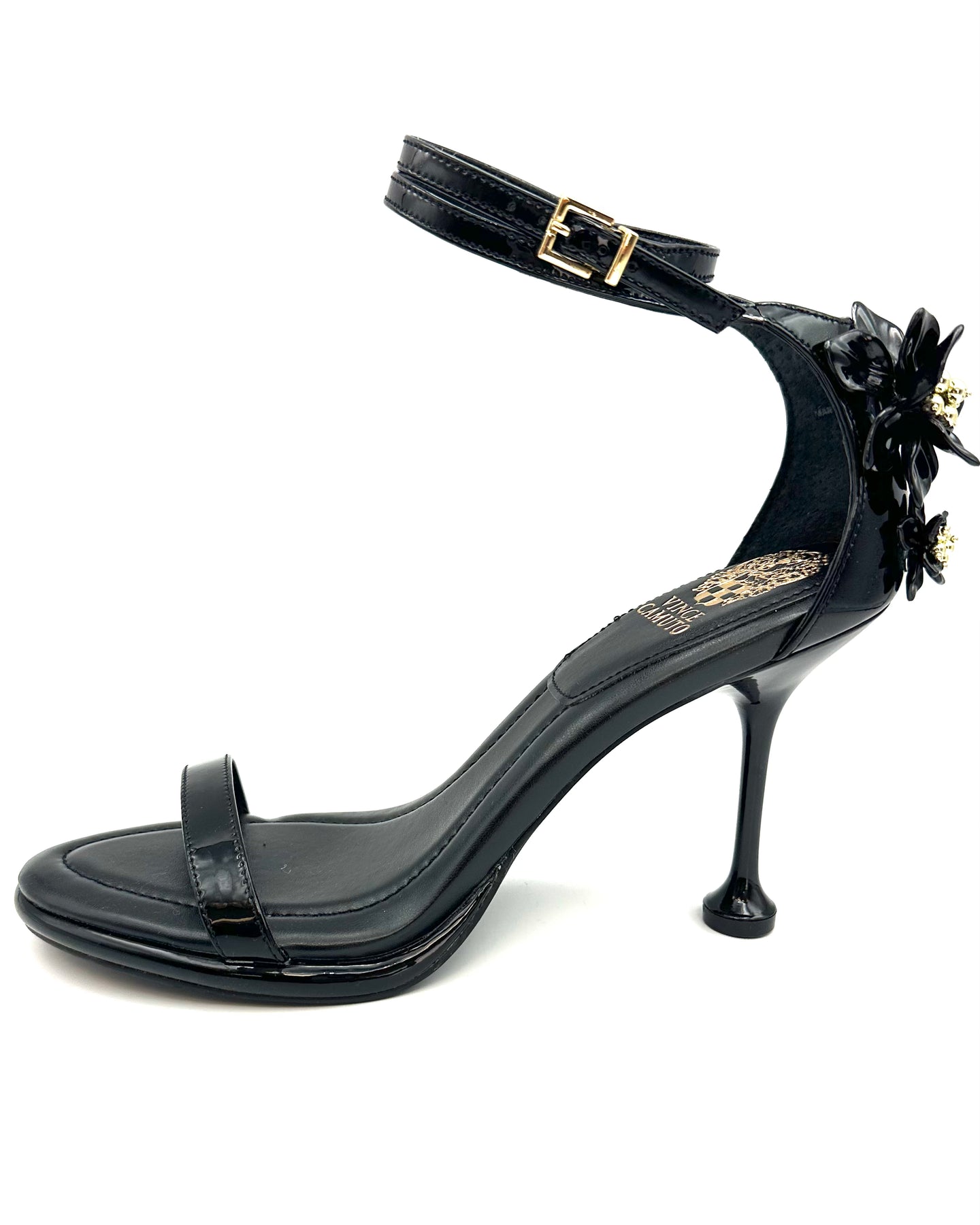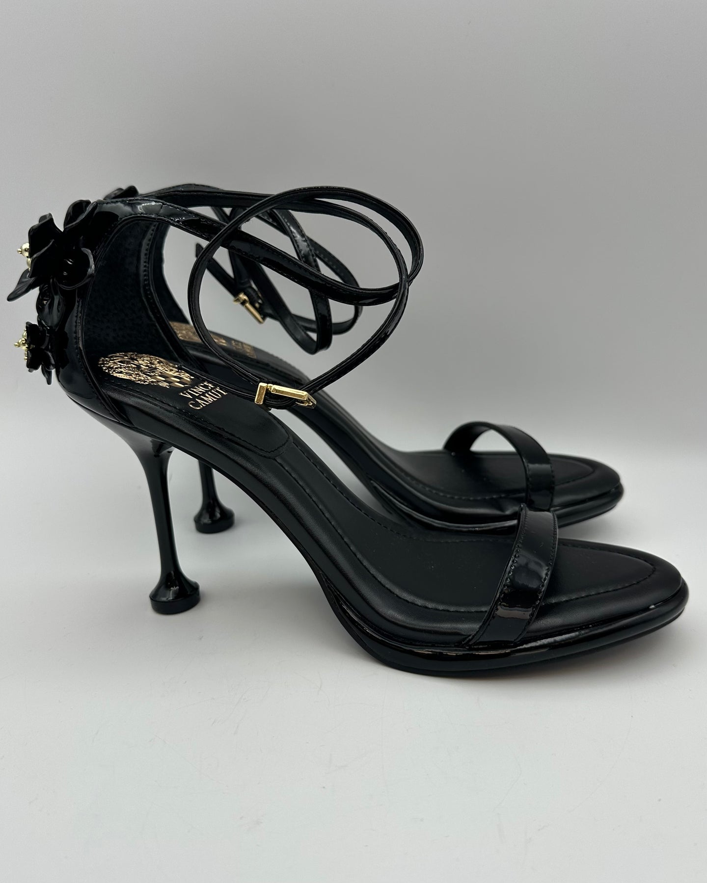 Vince Camuto black patent leather stiletto heels with a open rounded toe, wrap around adjustable ankle strap, thin heel and floral appliqués at the back with gold beads