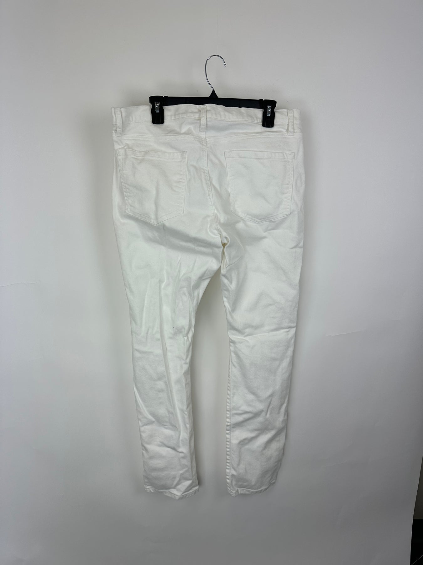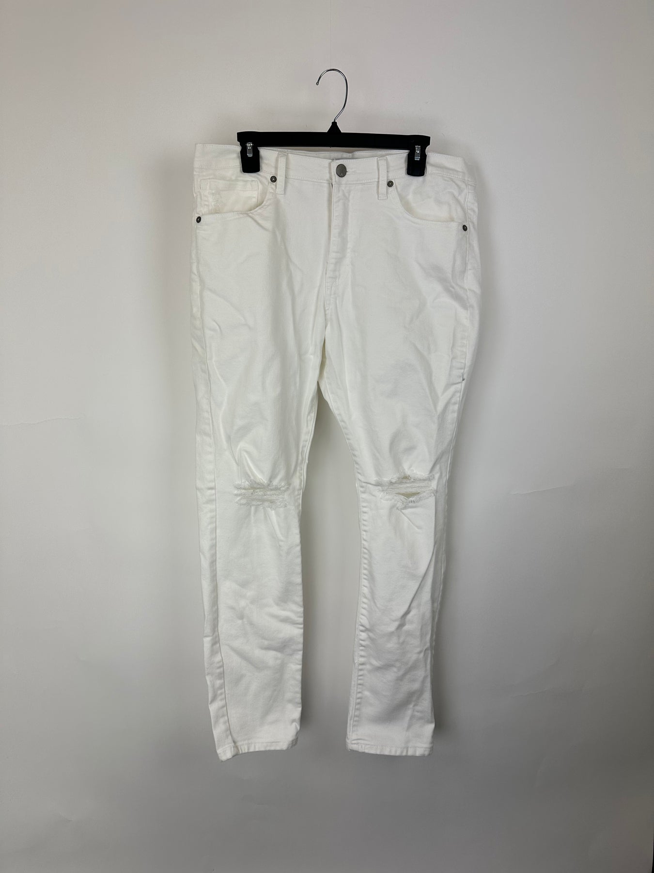 Men's white ripped skinny jeans with front pockets, dark silver hardware, slight rips in kneecaps, belt loops and back pockets