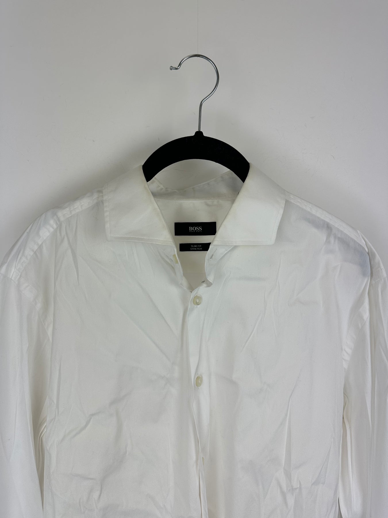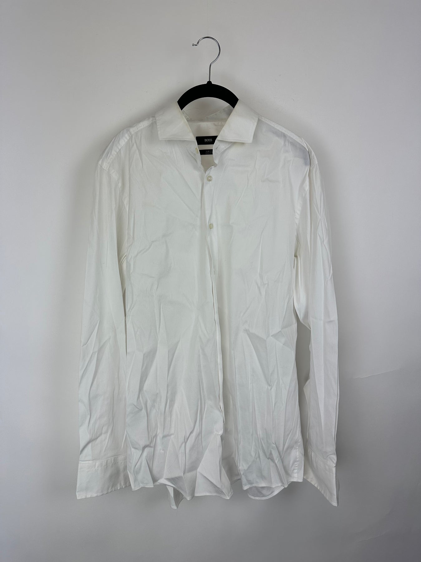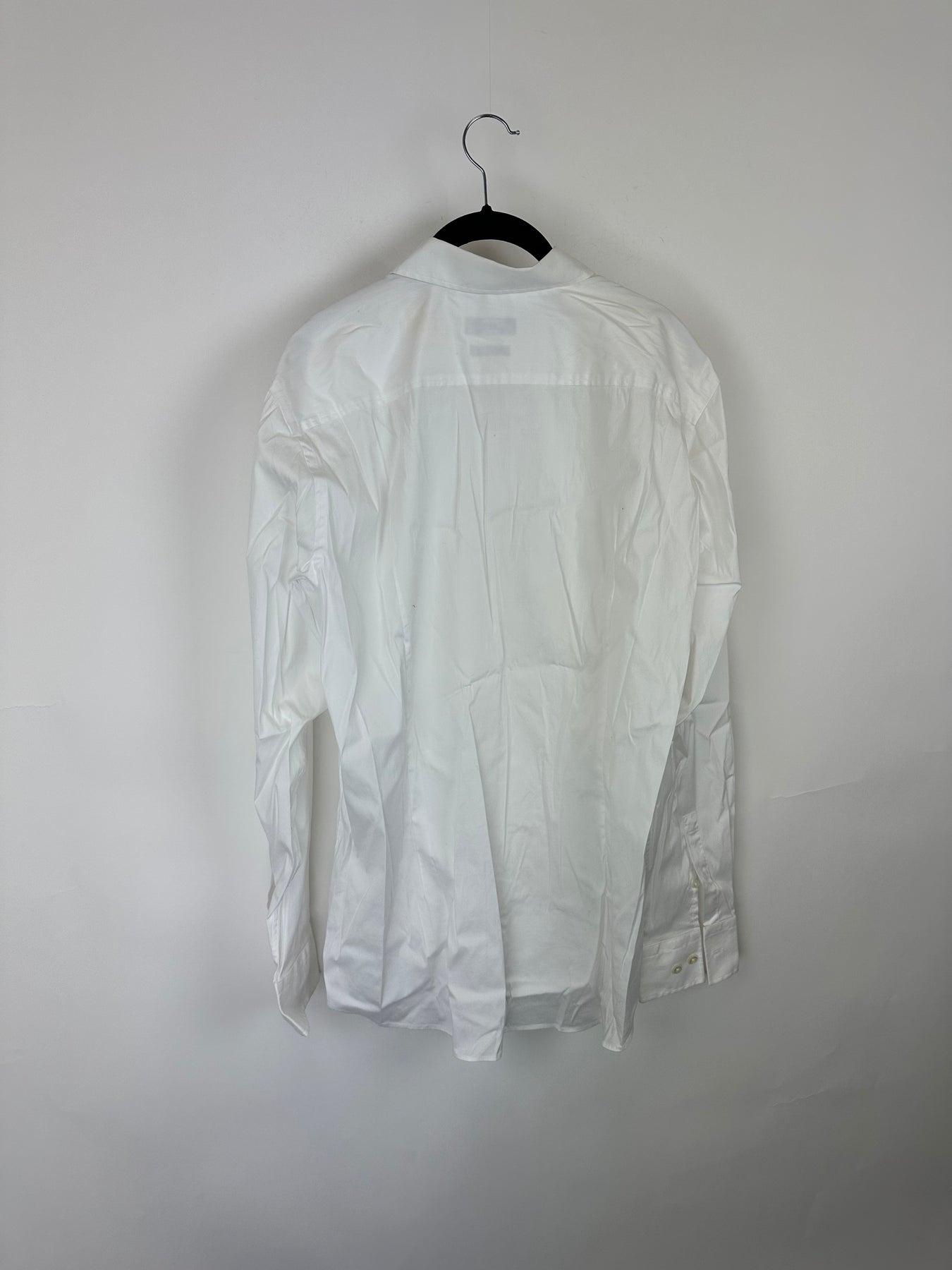 White button down dress shirt with collar, front button closure, long sleeves and buttons at wrists