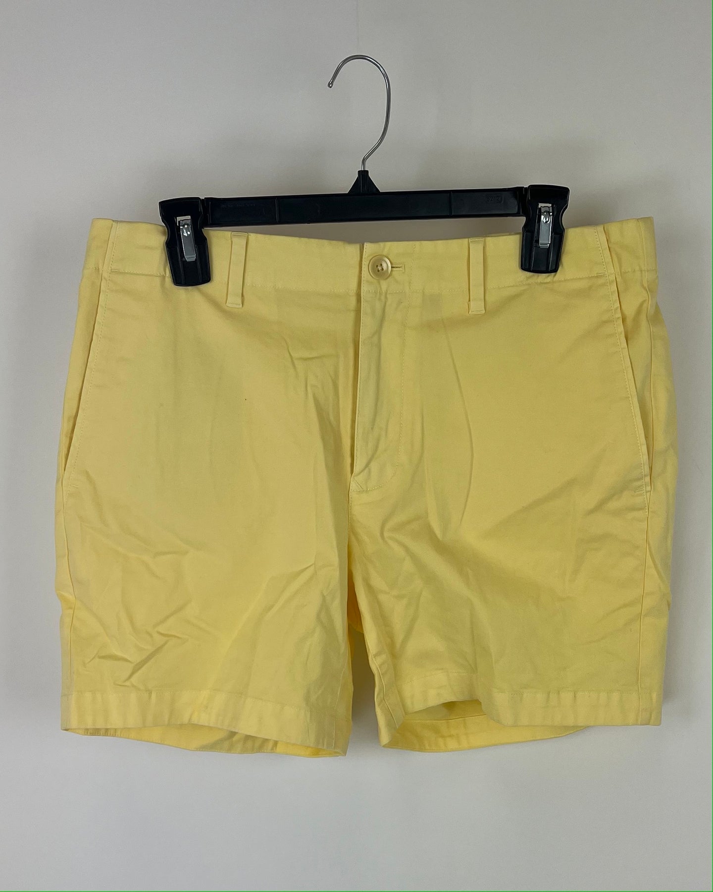 Bonobos pastel yellow colored chino shorts with side pockets, back pockets, belt loops and white plant print interior