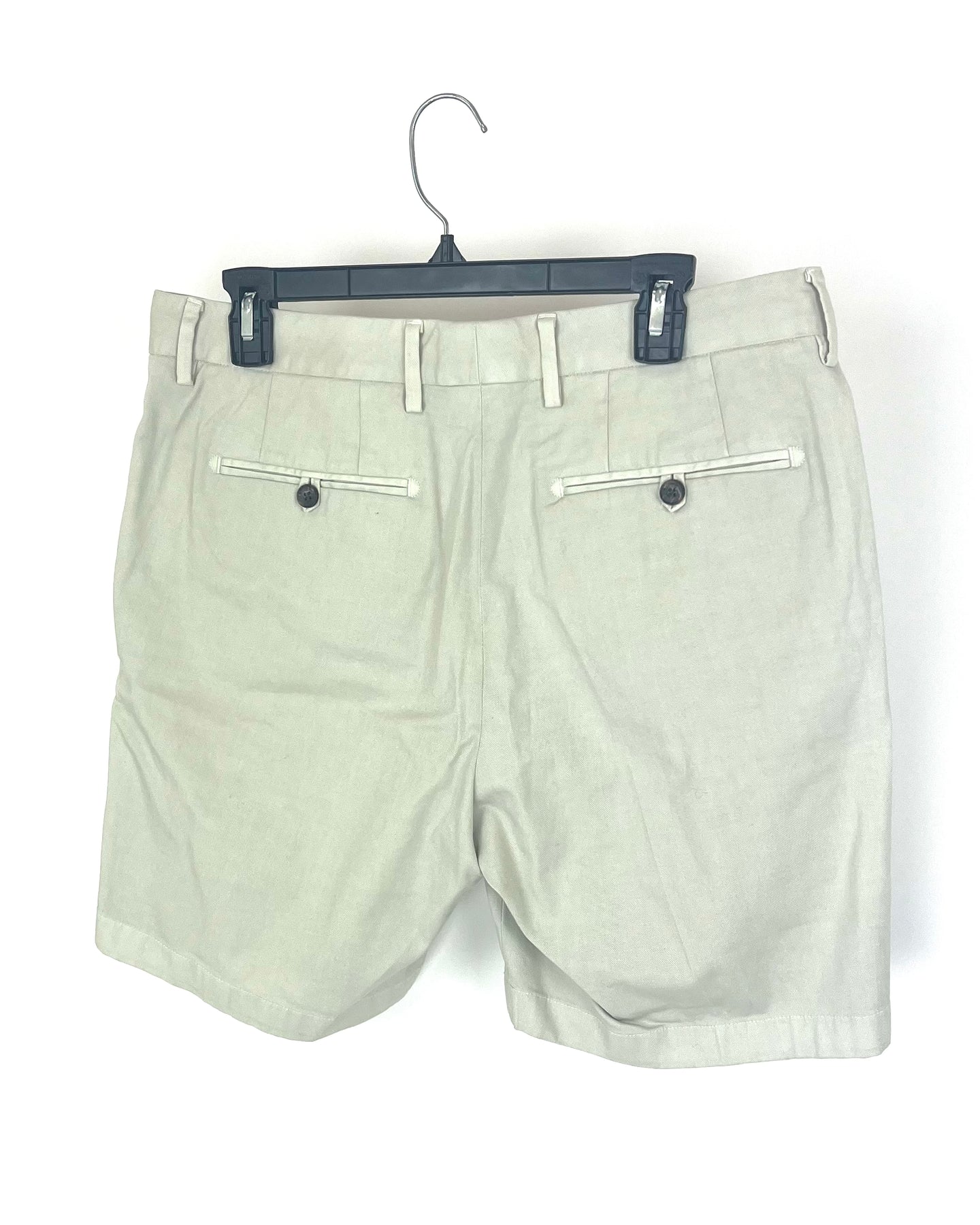 Bonobos mens vanilla shorts with a zipper and off center button closure, side pockets, two back pockets with button closure, belt loops and tan patterned interior lining