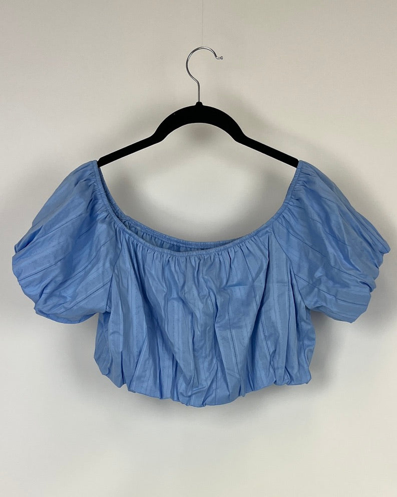 Almost Famous baby blue crop top with short puff sleeve and elastic trim on neckline and hem.