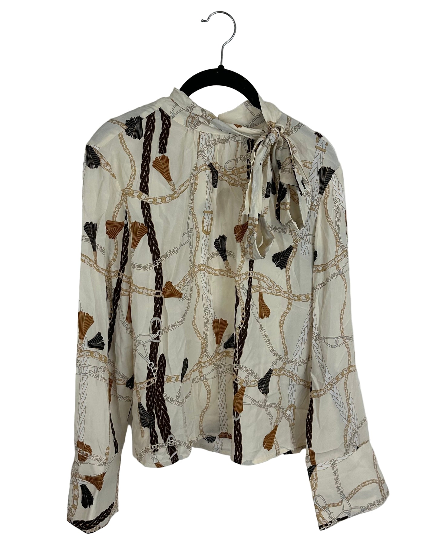 Unknown blouse with long sleeves, high neckline with button closure behind the neck, adjustable tie at the neckline, adjustable button sleeves in a lightweight, beige fabric with brown & white pattern detail.
