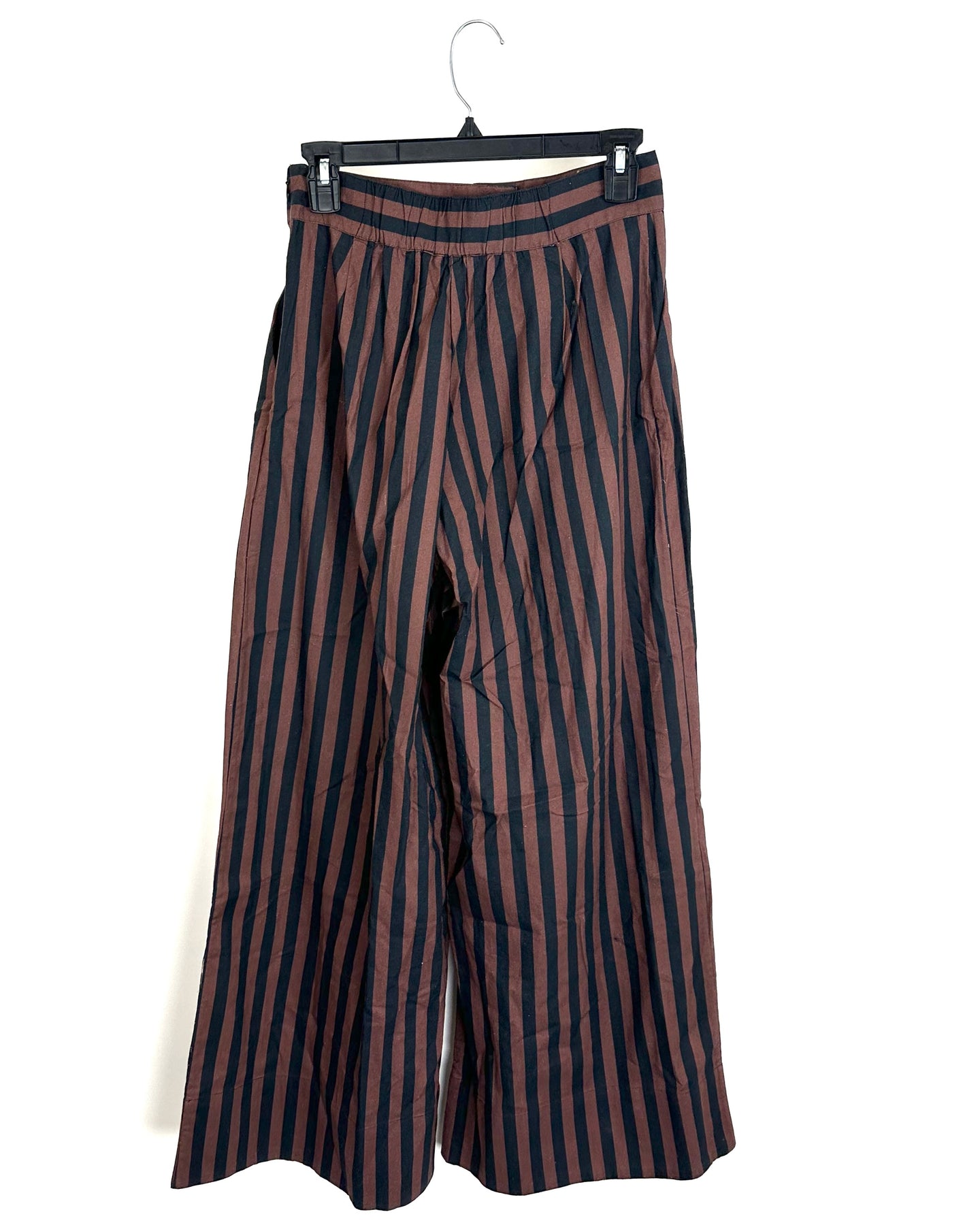 Reunited black and brown striped trousers, with pleats in the front and back of the pants, one button opening, with two front pockets, lightweight, loose fit in the leg, with an open hem, has some stretch in the elastic waistband