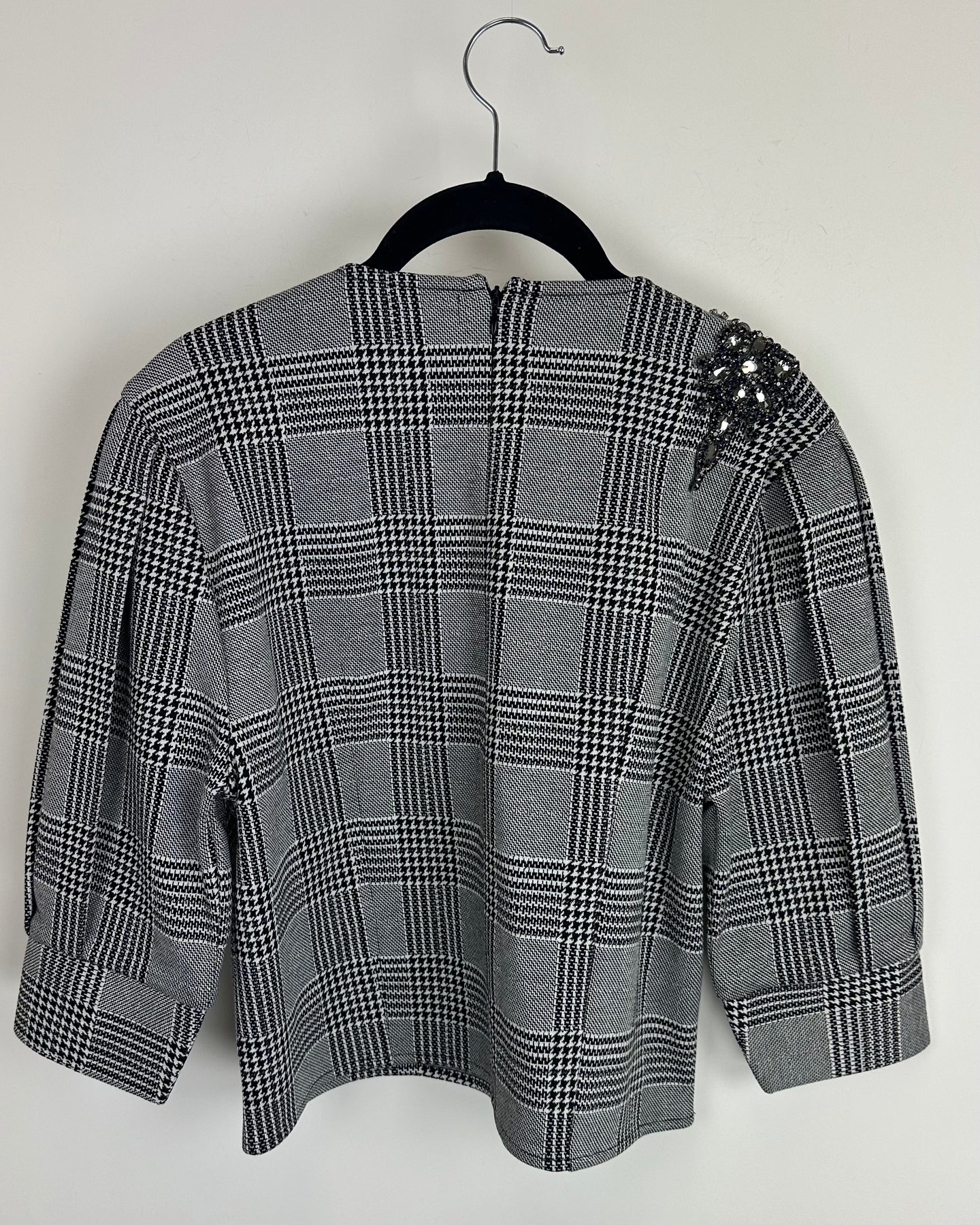 Marled black and white houndstooth top with three-quarter sleeves, round neckline and features an embellished detail with black and silver beading on one shoulder, back has a zipper closure for a structured fit
