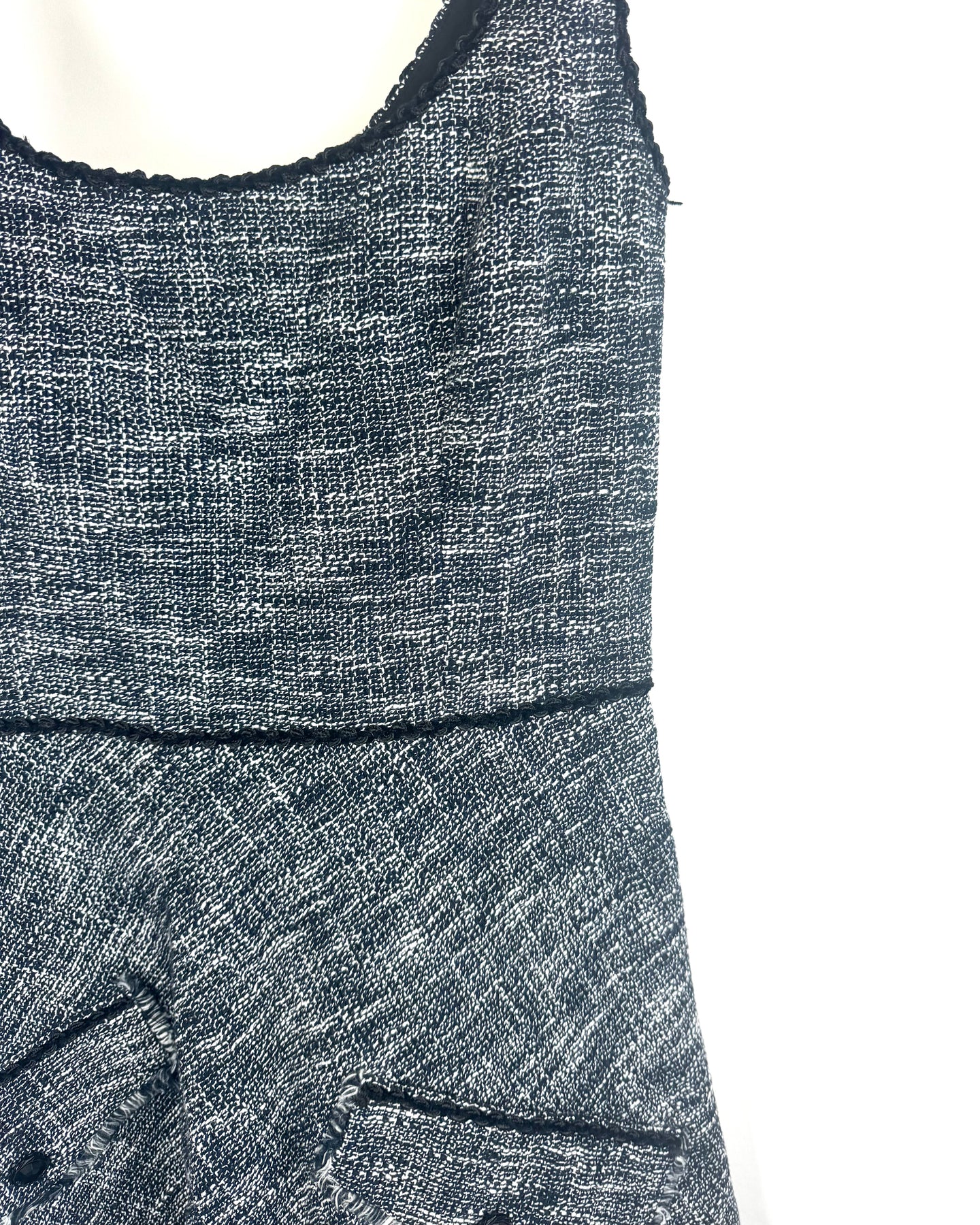 Shoshanna black and white tweed dress with rhinestone front pockets, a rope detialing around neckline and straps, back zipper, and made with a fitted non-stretchy material