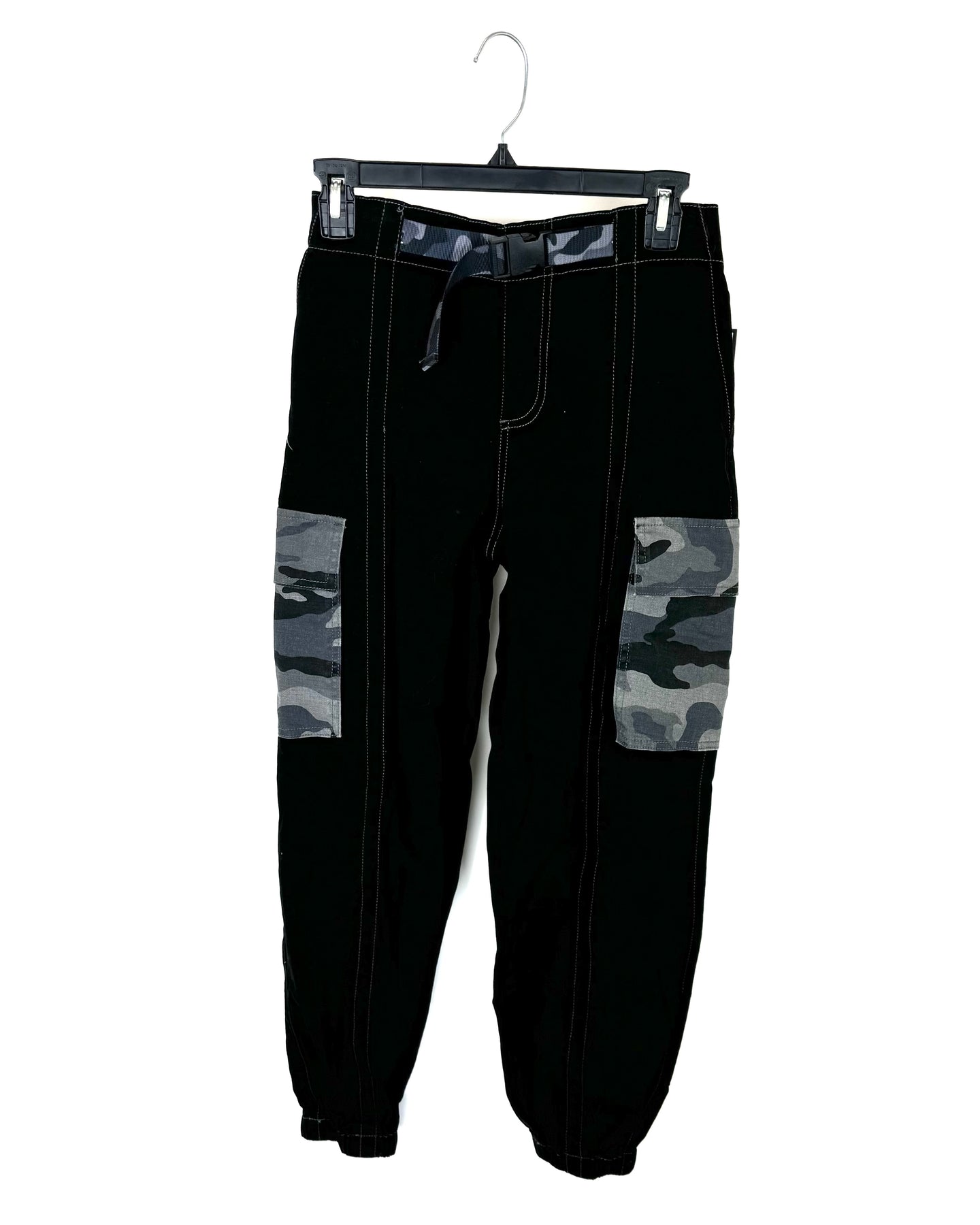 Almost Famous black cargo jogger bottoms with two gray camouflage pockets, gray stitching, a stretchy waistband, and a gray camouflage faux buckle belt