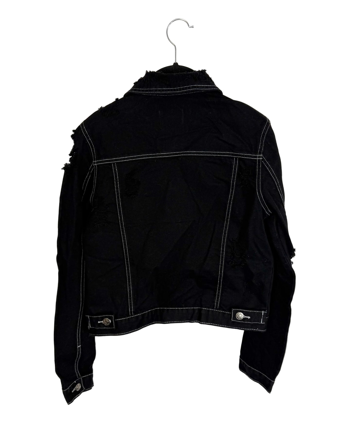 Almost famous black denim jacket with white stitching, silver hardware, long sleeves, front pocket, and ripped detailing.