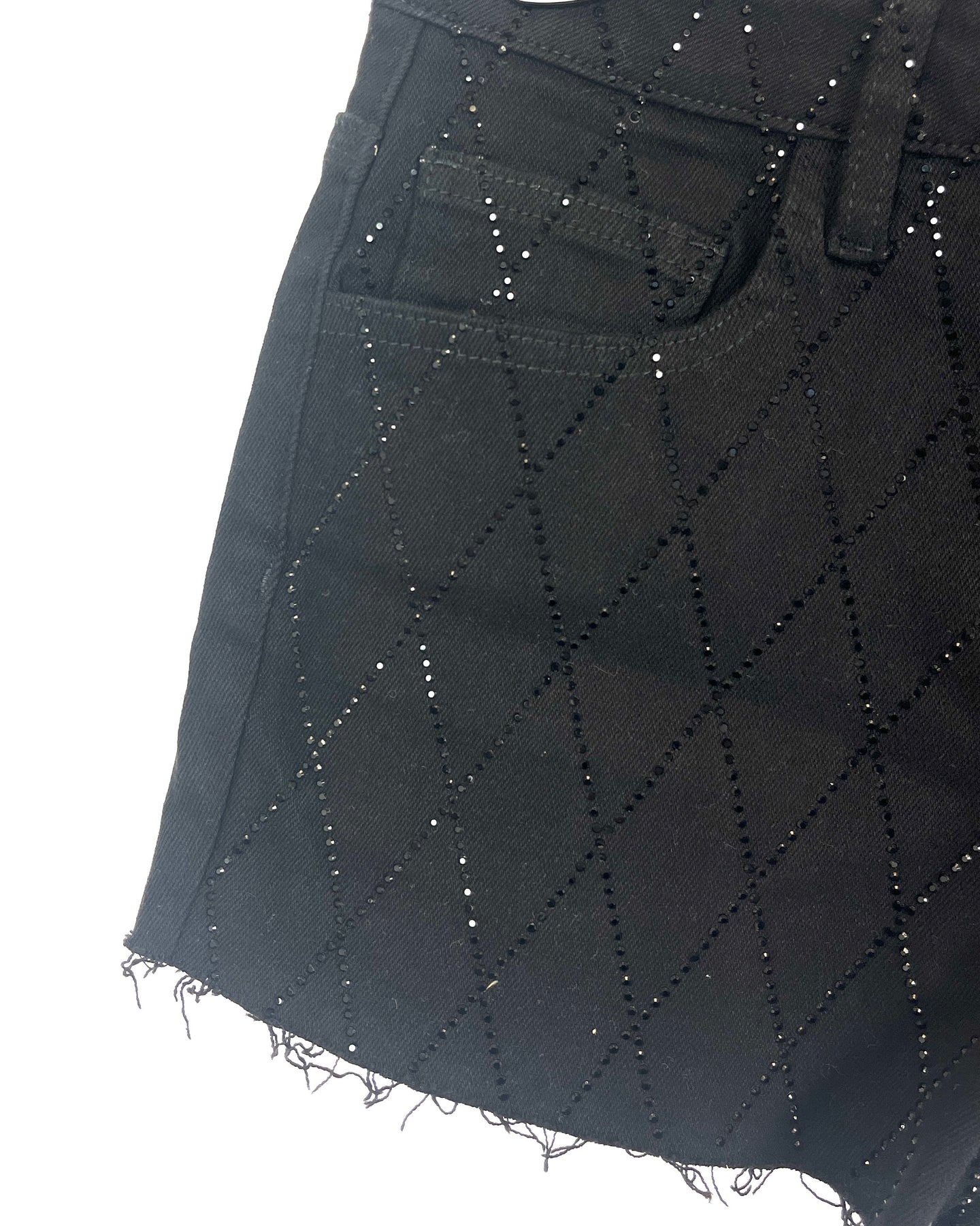Almost Famous black denim shorts with two front pockets, two back pockets, a silver button, and black rhinestones in a diamond-shaped pattern