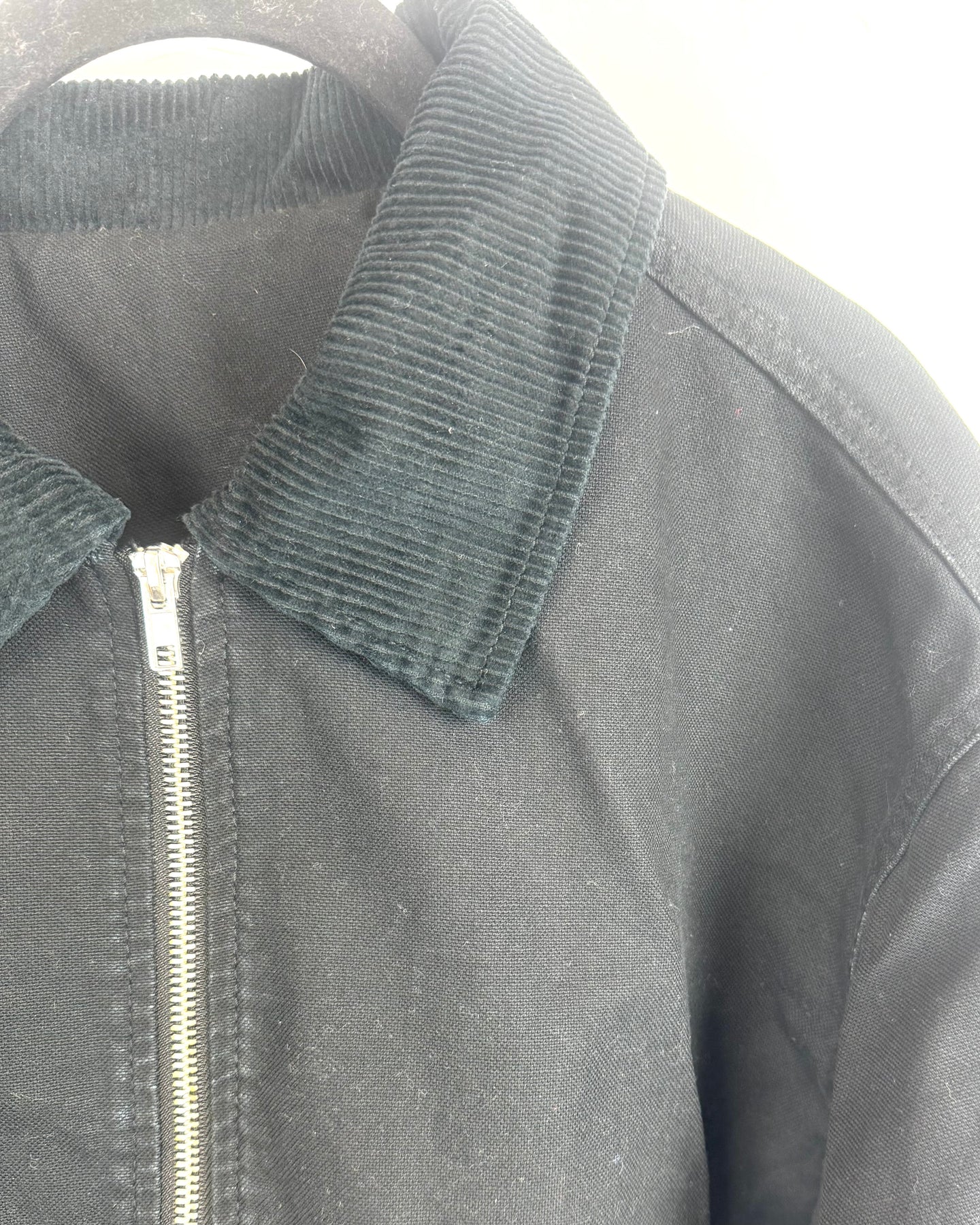 Black denim trucker jacket with a zip up closure, corduroy collar and large side pockets made with a structured fabric