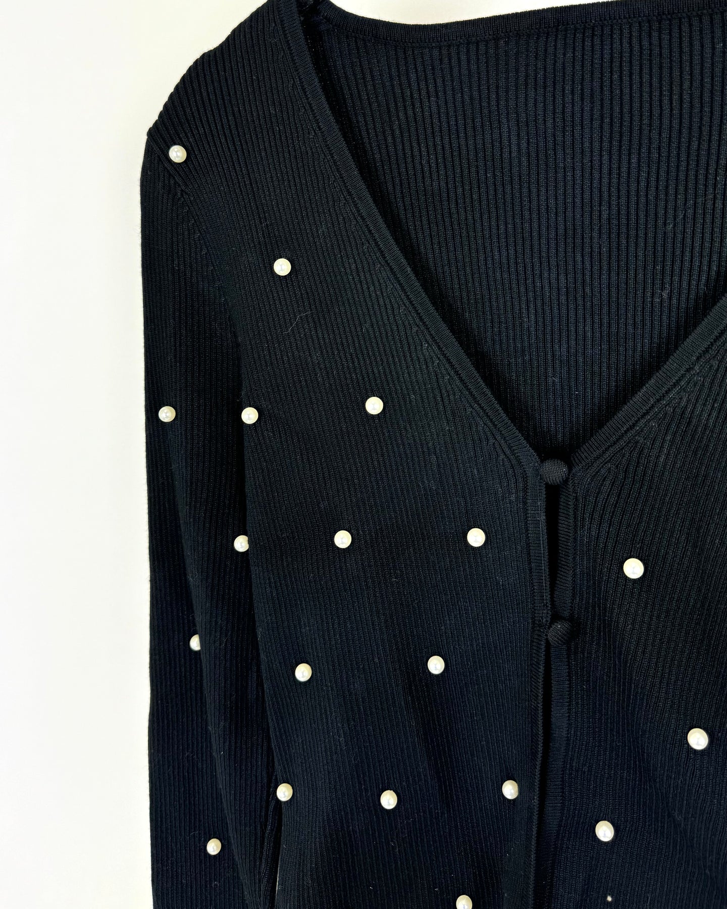Almost Famous black sweater with white pearls, a v-neckline, ribbed sweater material, and two buttons in the front to close