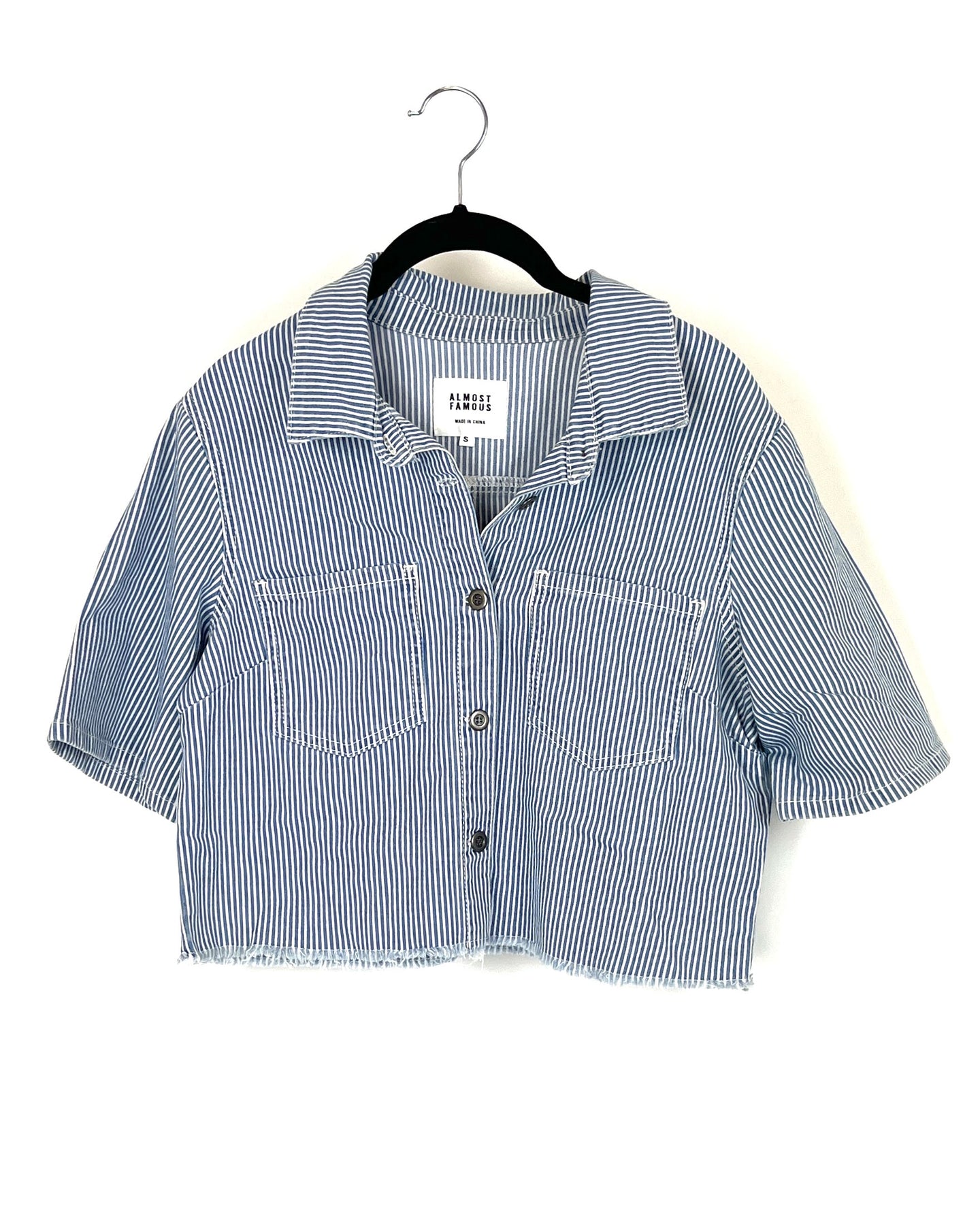 Almost Famous blue and white striped button-up in a denim-like material with short sleeves, two front pockets, silver buttons, and a collared neckline