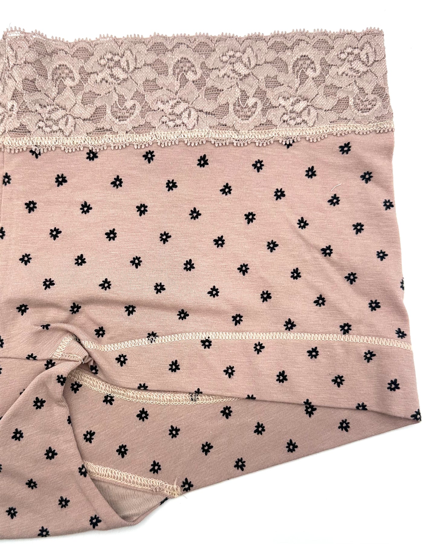 Two pack of boy short underwear in pink abstract print and red and brown and black floral print with lace trim