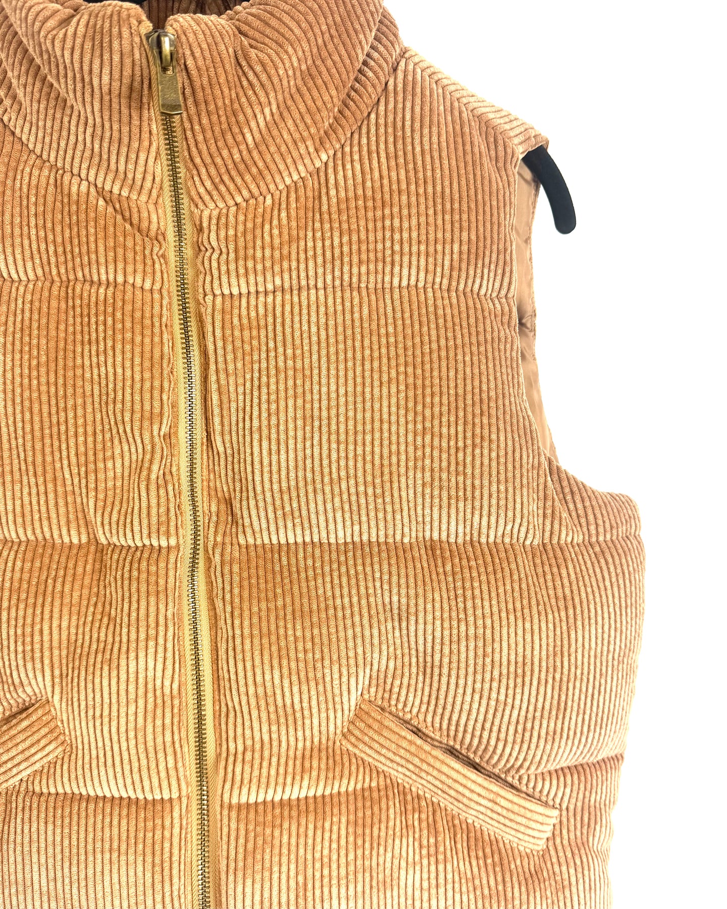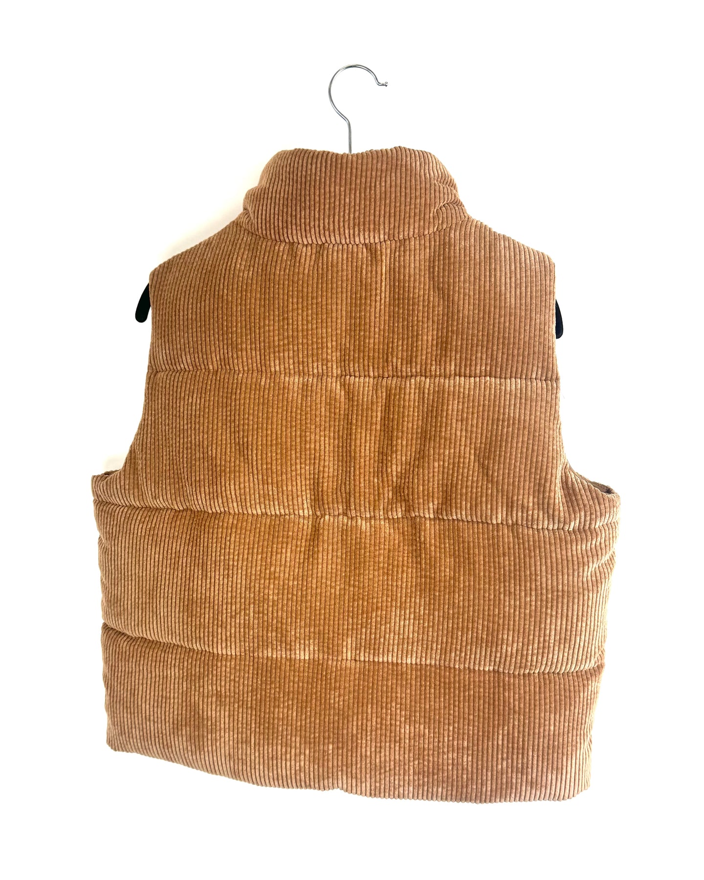 Grace & Lace brown corduroy puffer vest with a zipper closure and side pockets with a cropped fit