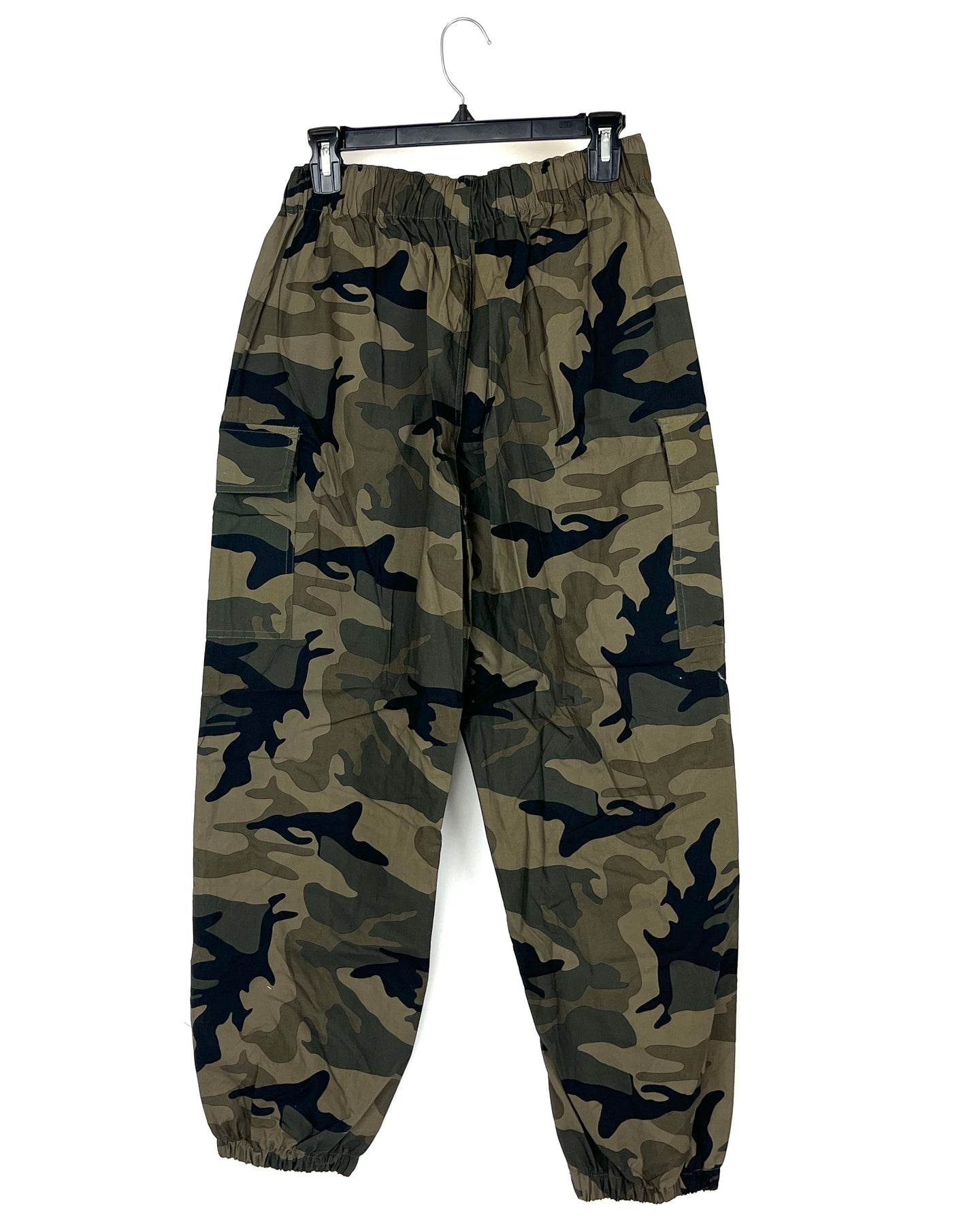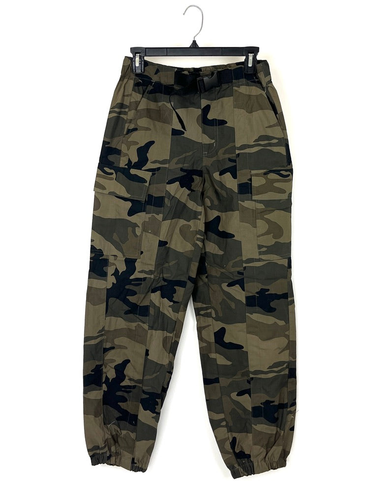 Almost Famous camo cargo parachute joggers with buckle, zipper and button closure, two pockets and two cargo pockets.