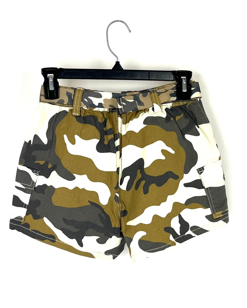Almost Famous camo cargo shorts with camo adjustable buckle belt, zipper and button closure, two pockets on the side and two cargo pockets.