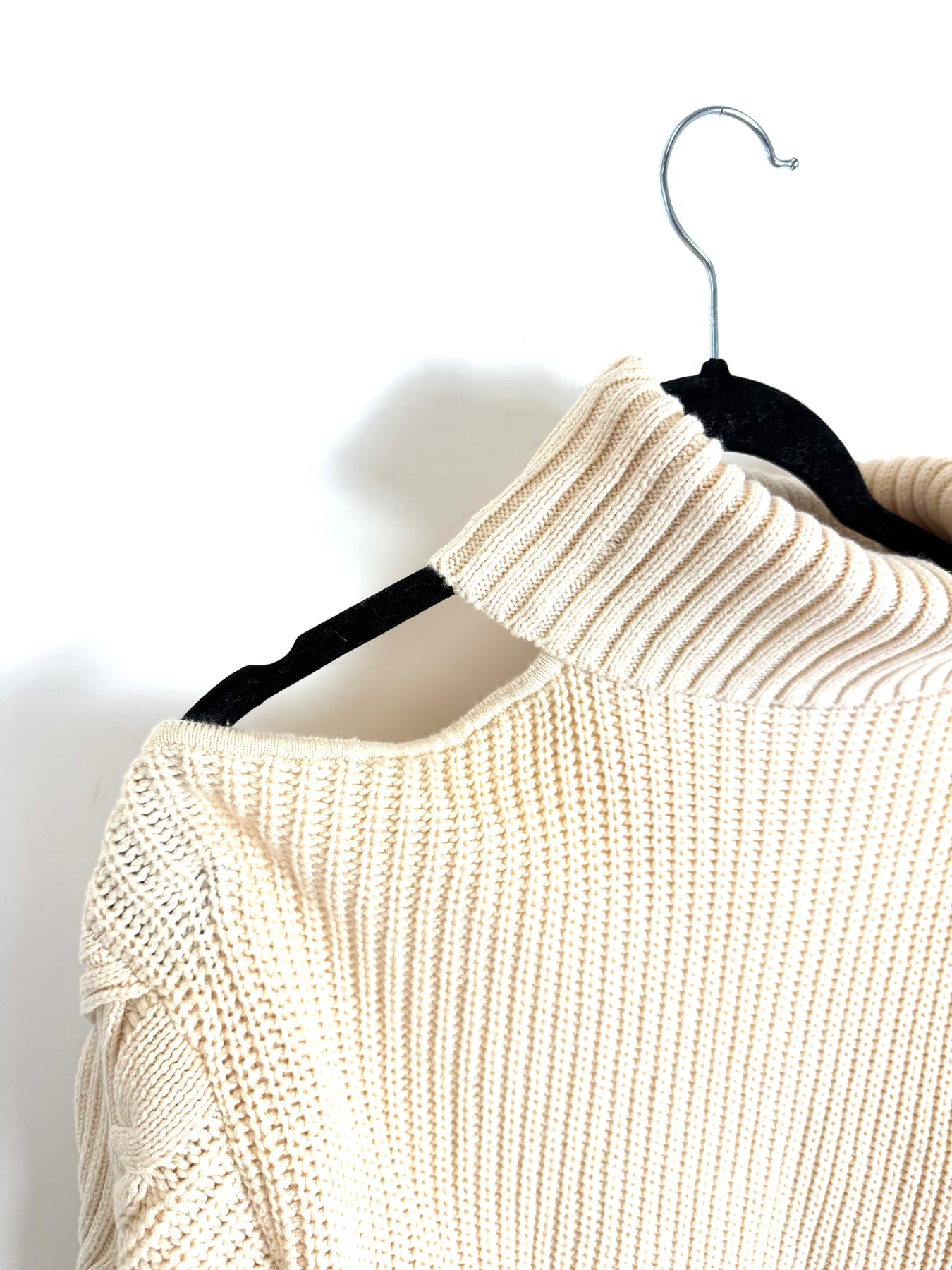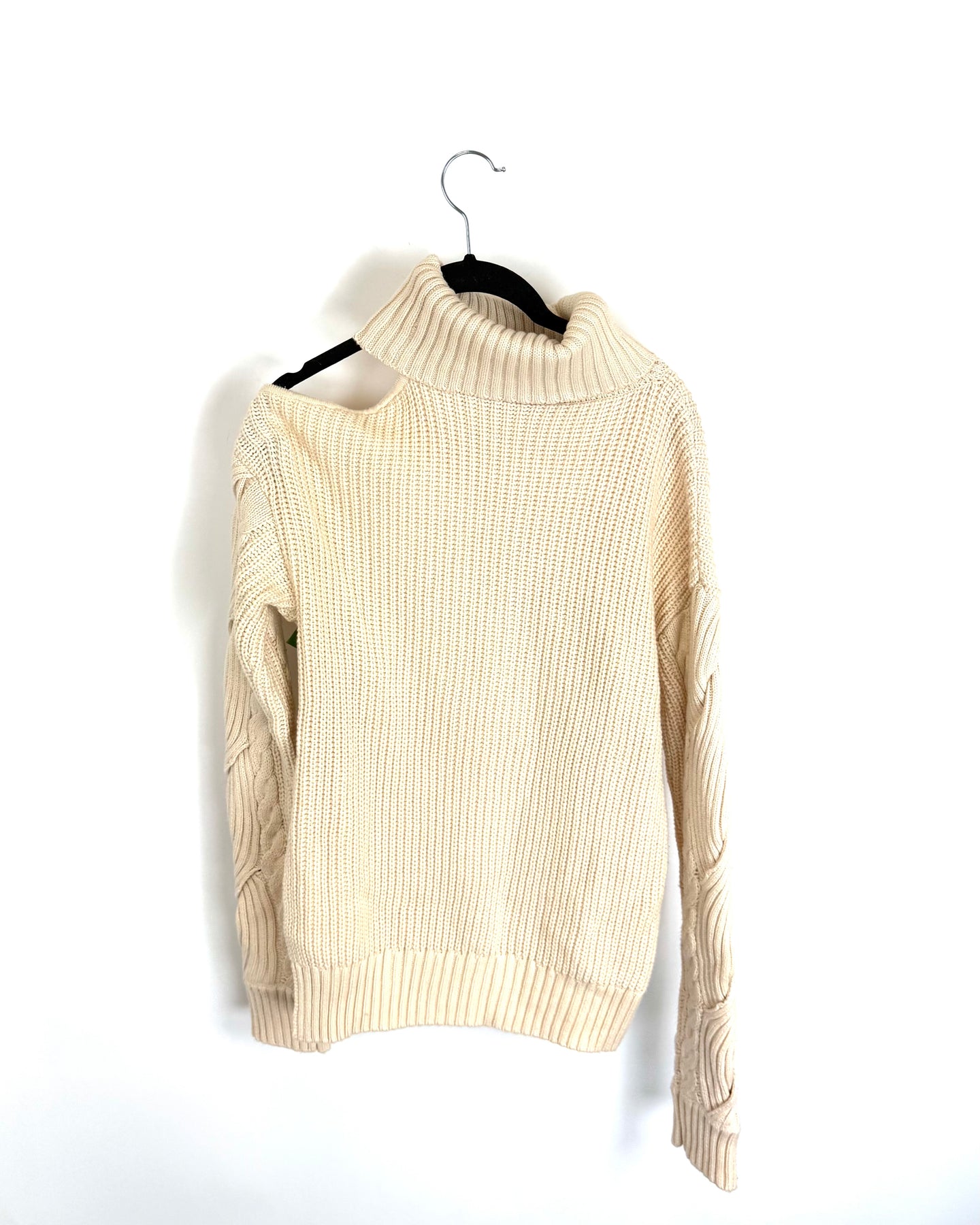 Cream white turtle neck sweater with one cold shoulder, long sleeves and a thick soft knit feel