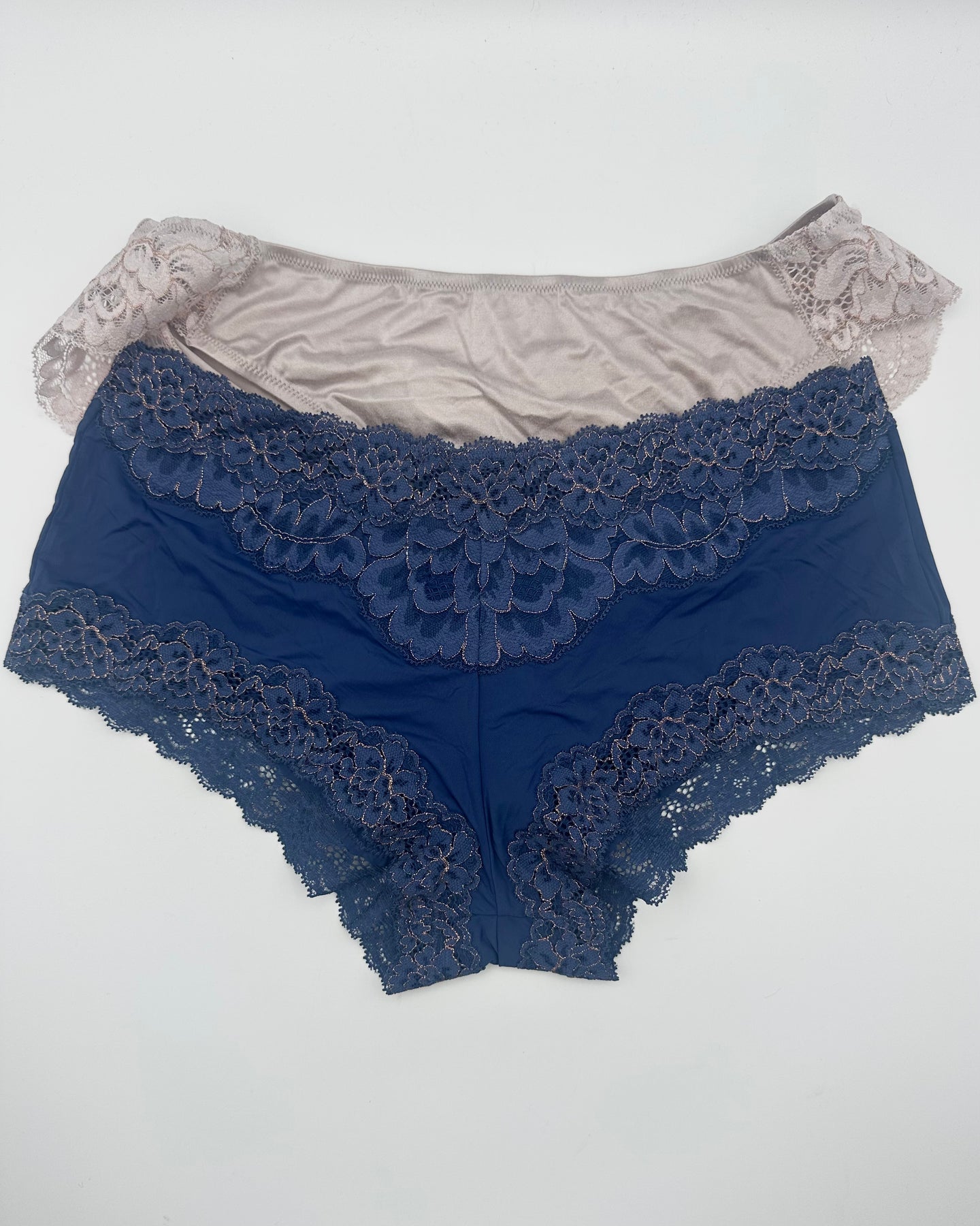 Two pack of underwear in a light pink and lace bikini and a dark blue and lace boy short with rose gold metallic lace detail