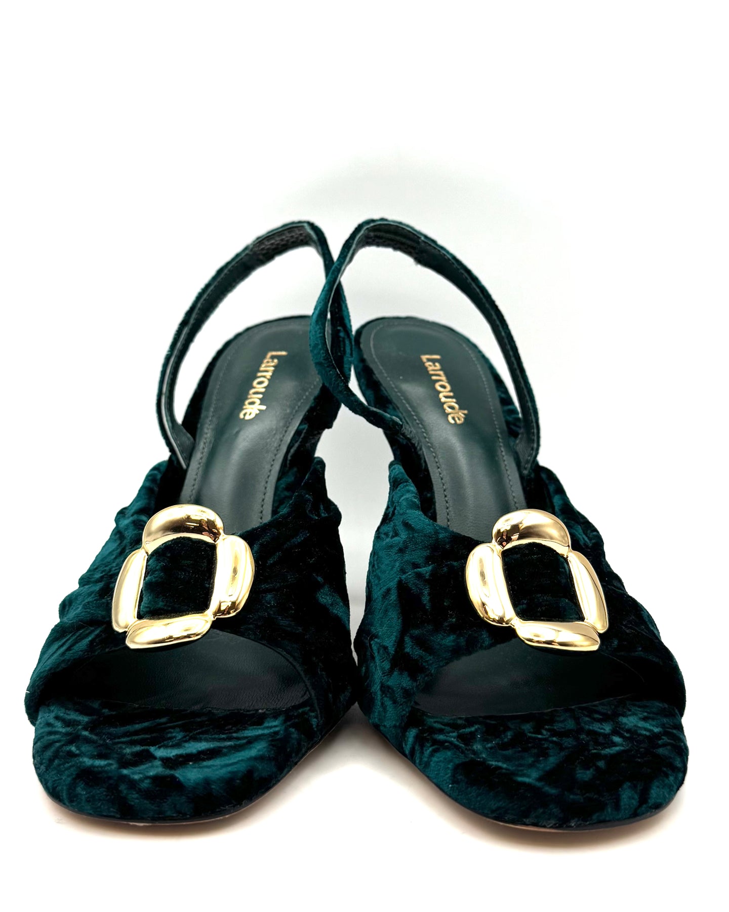 Larroudé dark emerald green heels with gold floral emblem at toe, open toe front and non adjustable single strap back. These shoes are brand new with no wear to the soles or velour.