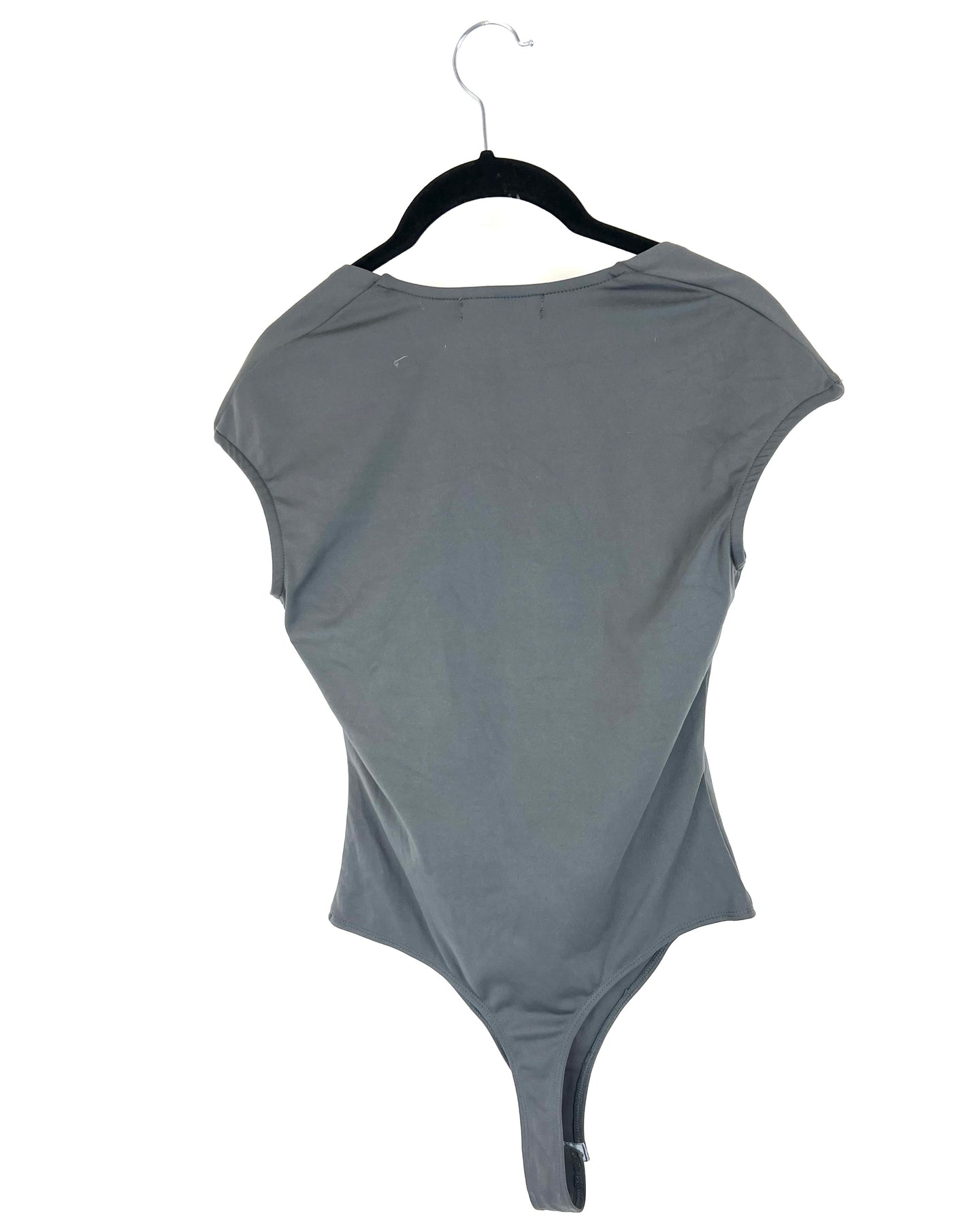 Almost Famous dark grey body suit with short sleeves and square neckline and thong bottom and button clasps