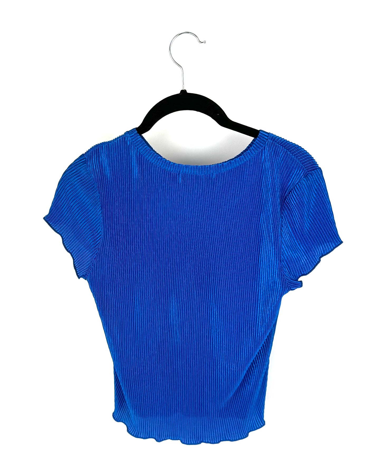 Almost Famous dark ocean blue short sleeve plissé/textured top with slightly ruffled hem.