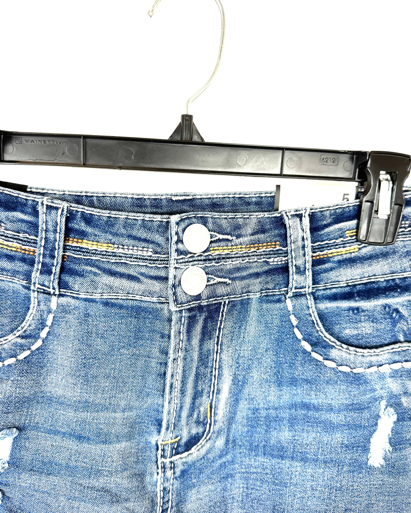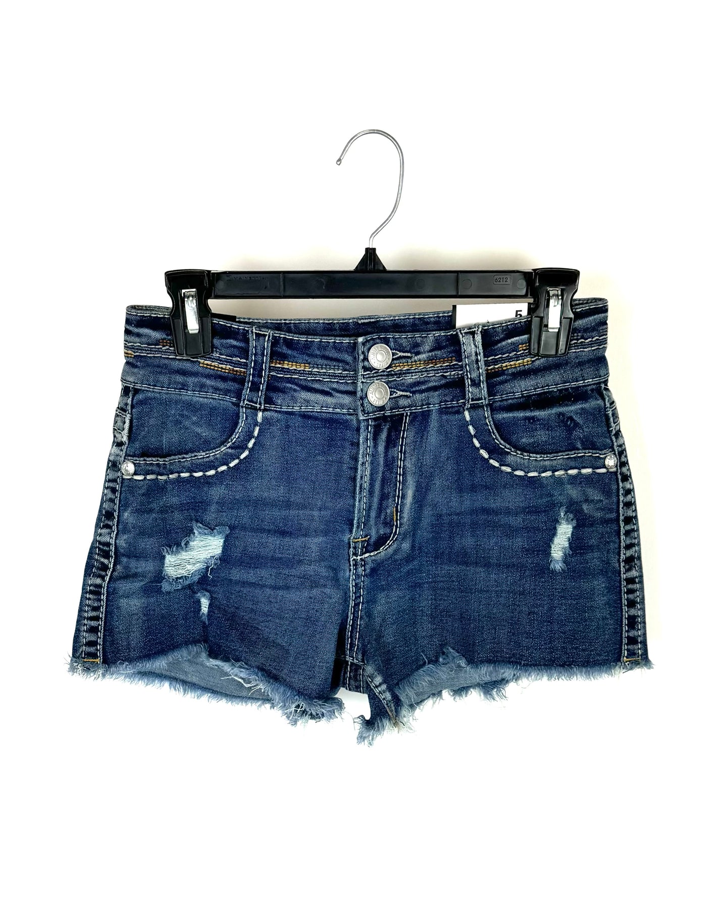 Almost Famous dark wash high-rise shorts with two silver buttons, distressed rips, a frayed hem, white and brown stitching details, and two rhinestones on each pocket