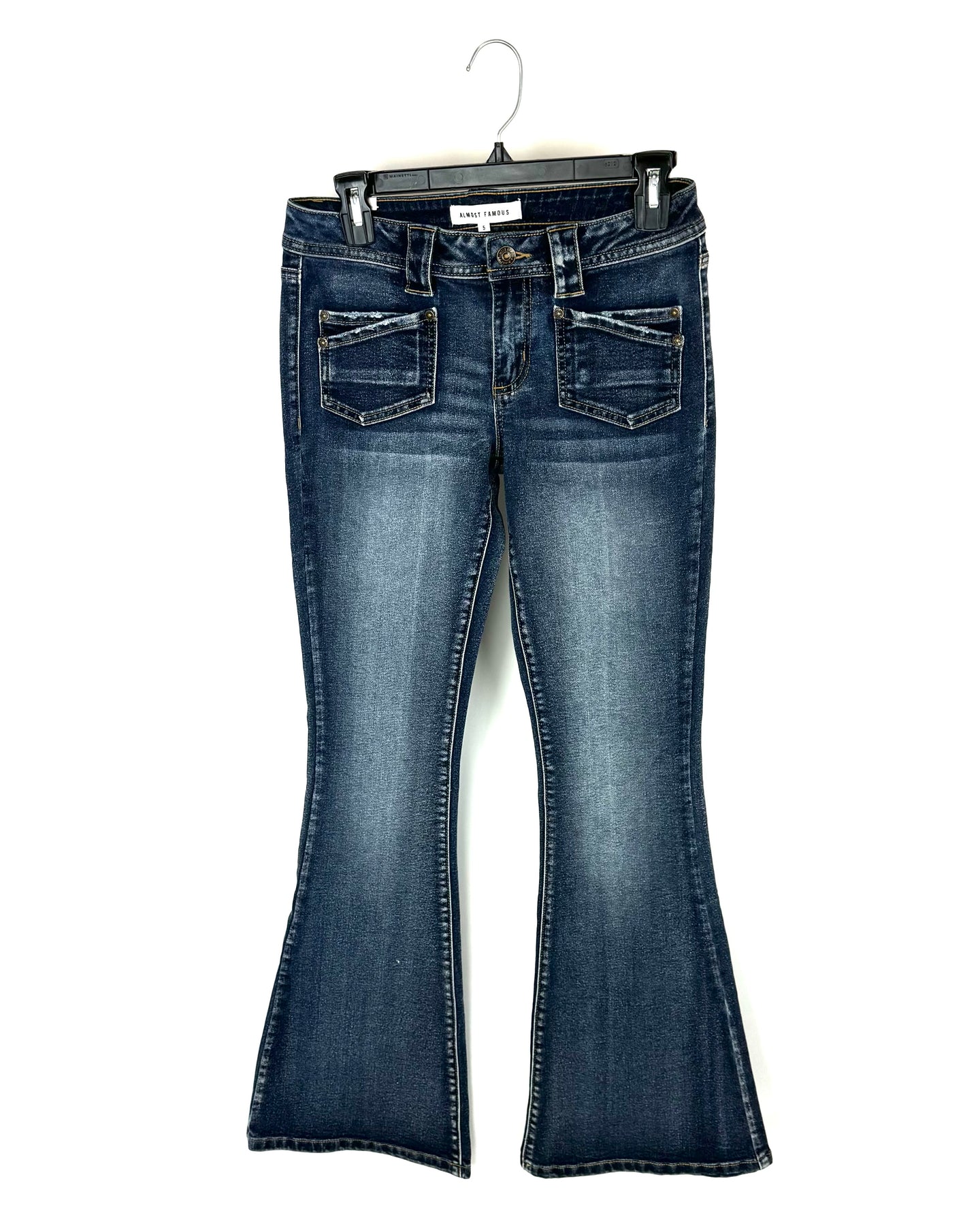 Almost Famous low-rise, dark wash, flare jeans with two front pocket details and brown stitching
