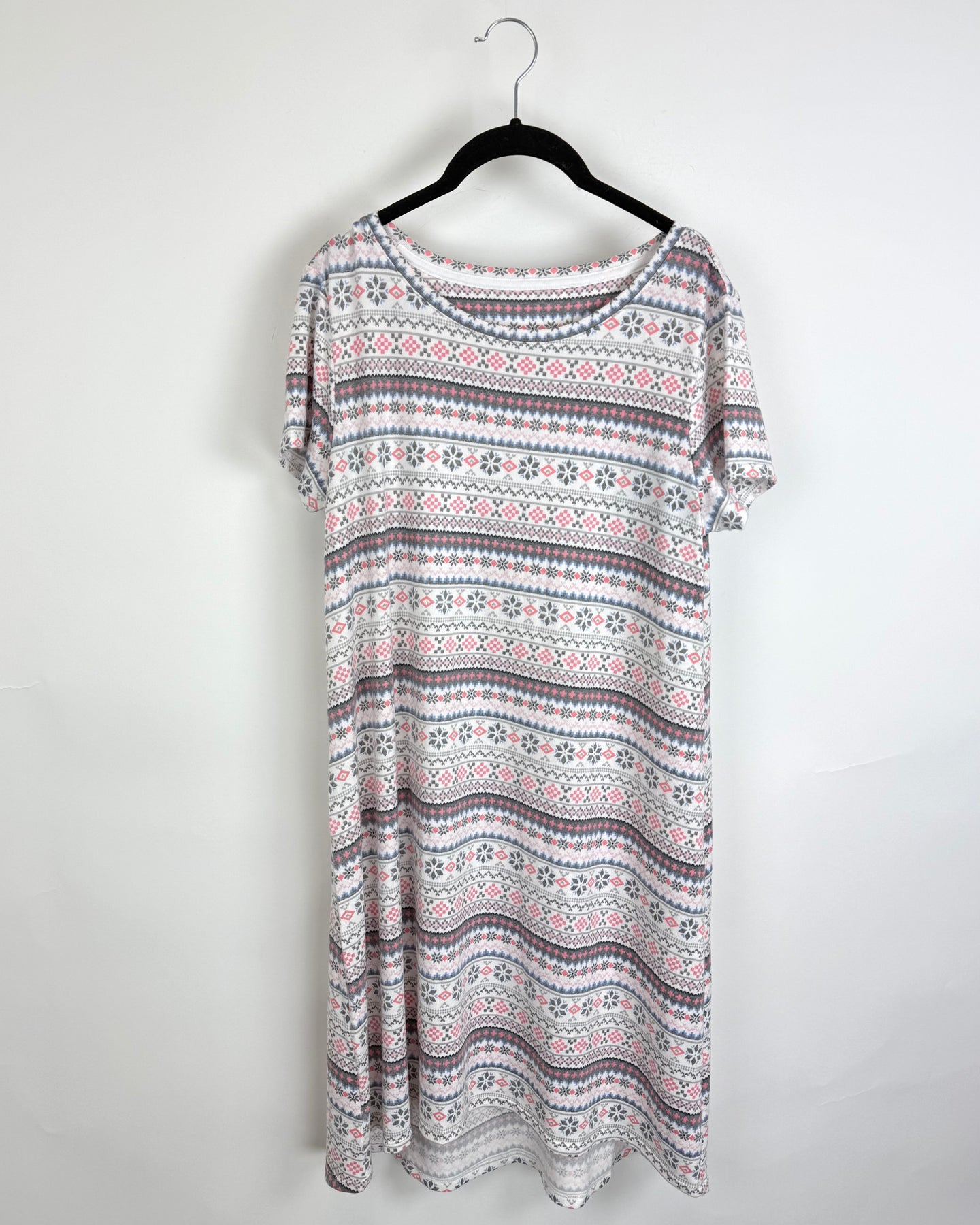 White with grey, pink and blue printed winter design with short sleeves and ultra soft stretchy fabric