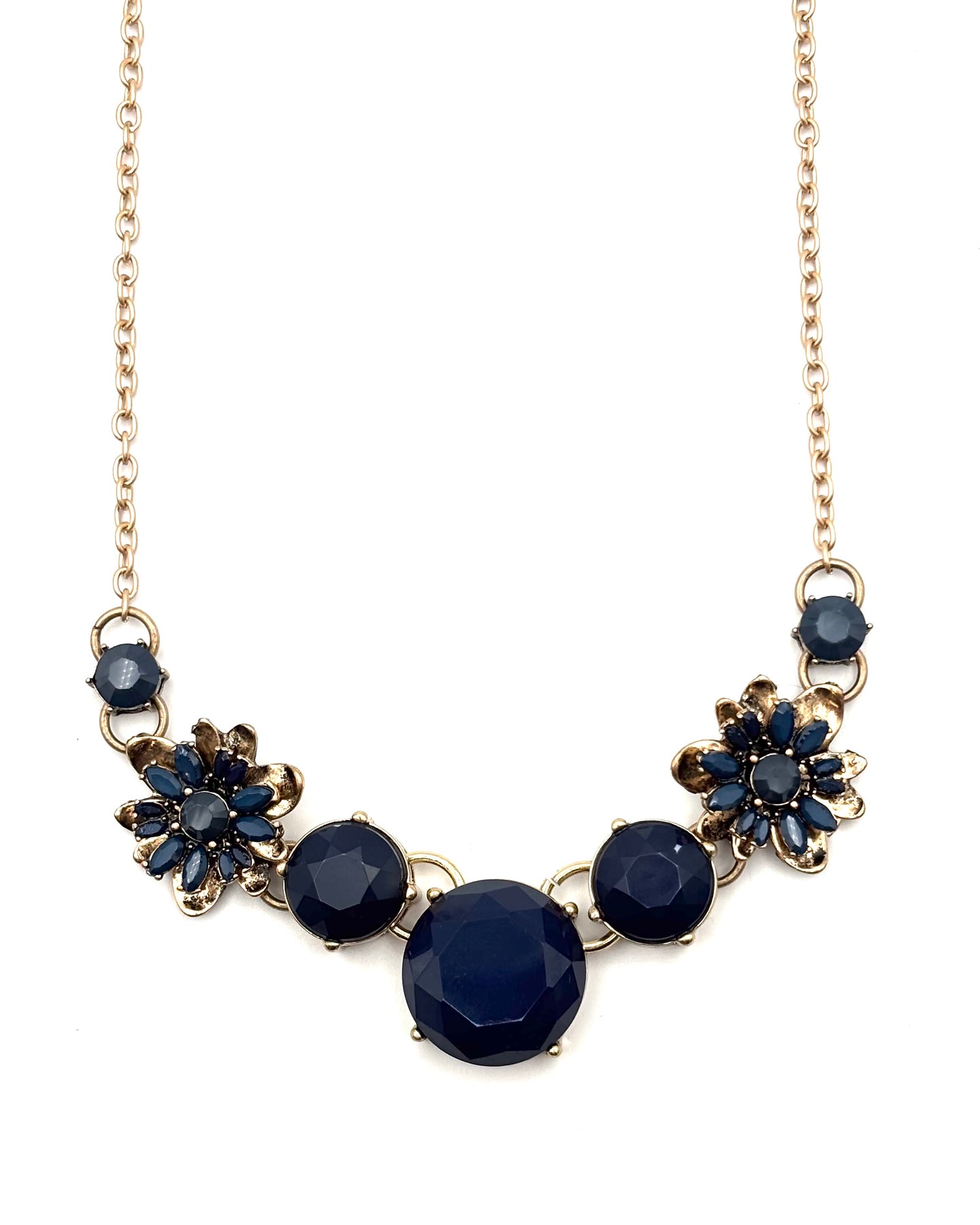 Gold chain necklace with a cluster of blue gemstone designs at the bottom, including 3 round, center gemstones, a flower design on each side, and a smaller gemstone on each side, with a clasp closure. Please note slight discoloration on this necklace