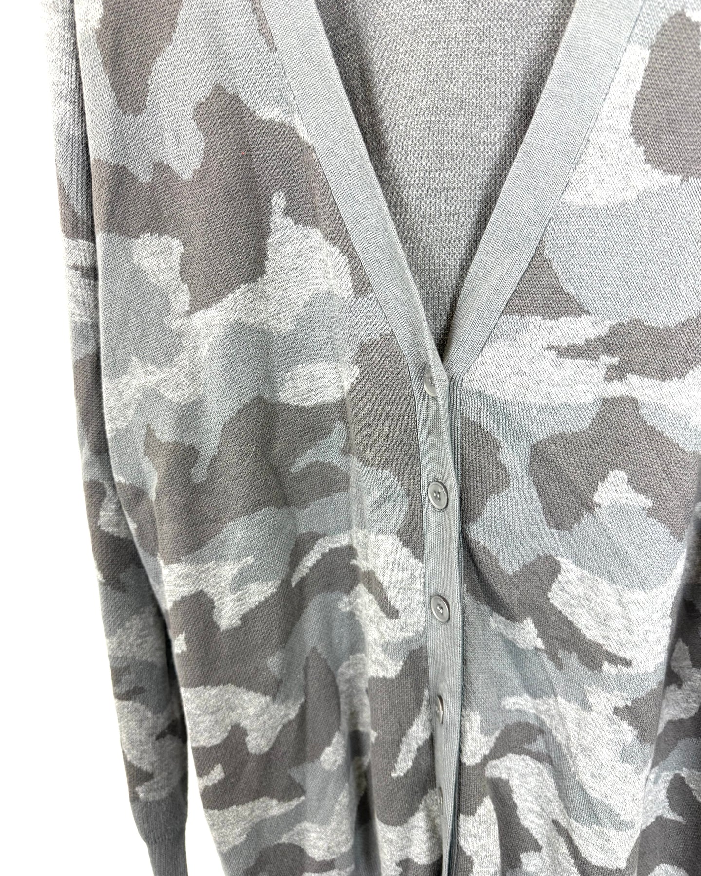 Lane Bryant gray camouflage printed cardigan with full button down front and long sleeves in a lightweight sweater material