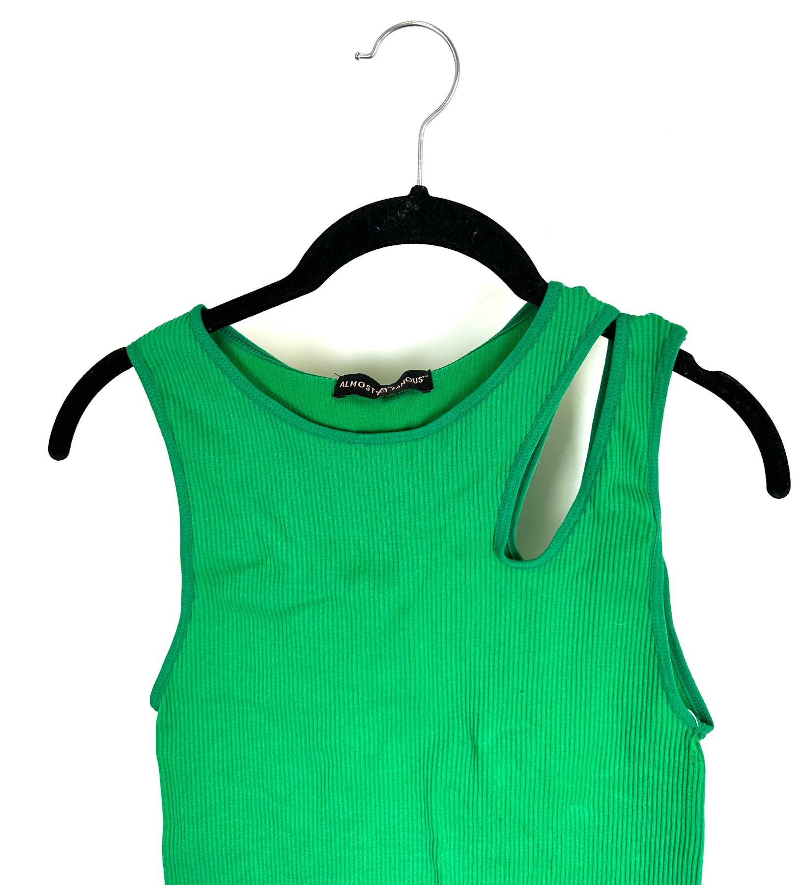 Almost Famous ribbed sleeveless tank top in vibrant green with a high neckline and a asymmetrical cutout at the shoulder. Has a soft, stretchy ribbed fabric that offers a body-hugging fit.