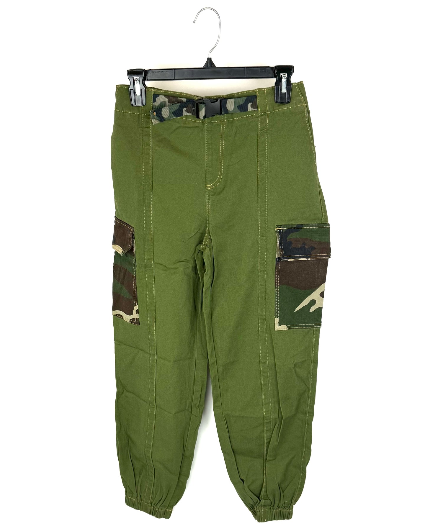 Almost Famous green cargo joggers with two green camouflage pockets, brown stitching, a stretchy waistband, and a green camouflage adjustable buckle belt