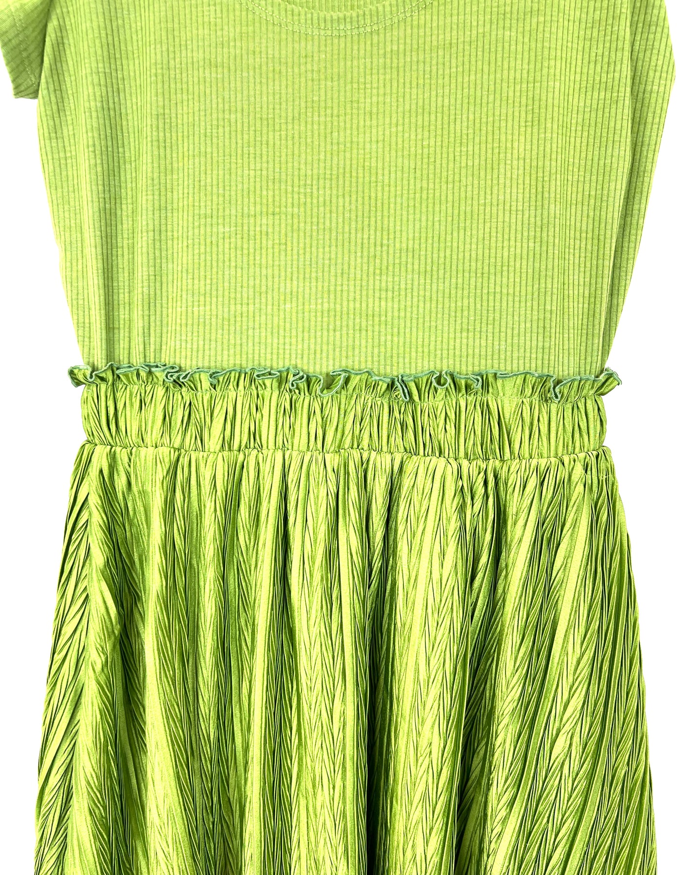 Almost Famous green short sleeve dress with scoop neckline ribbed top and textured plisse skirt detail from the waist down with ruffled detail at waistline and bottom hem