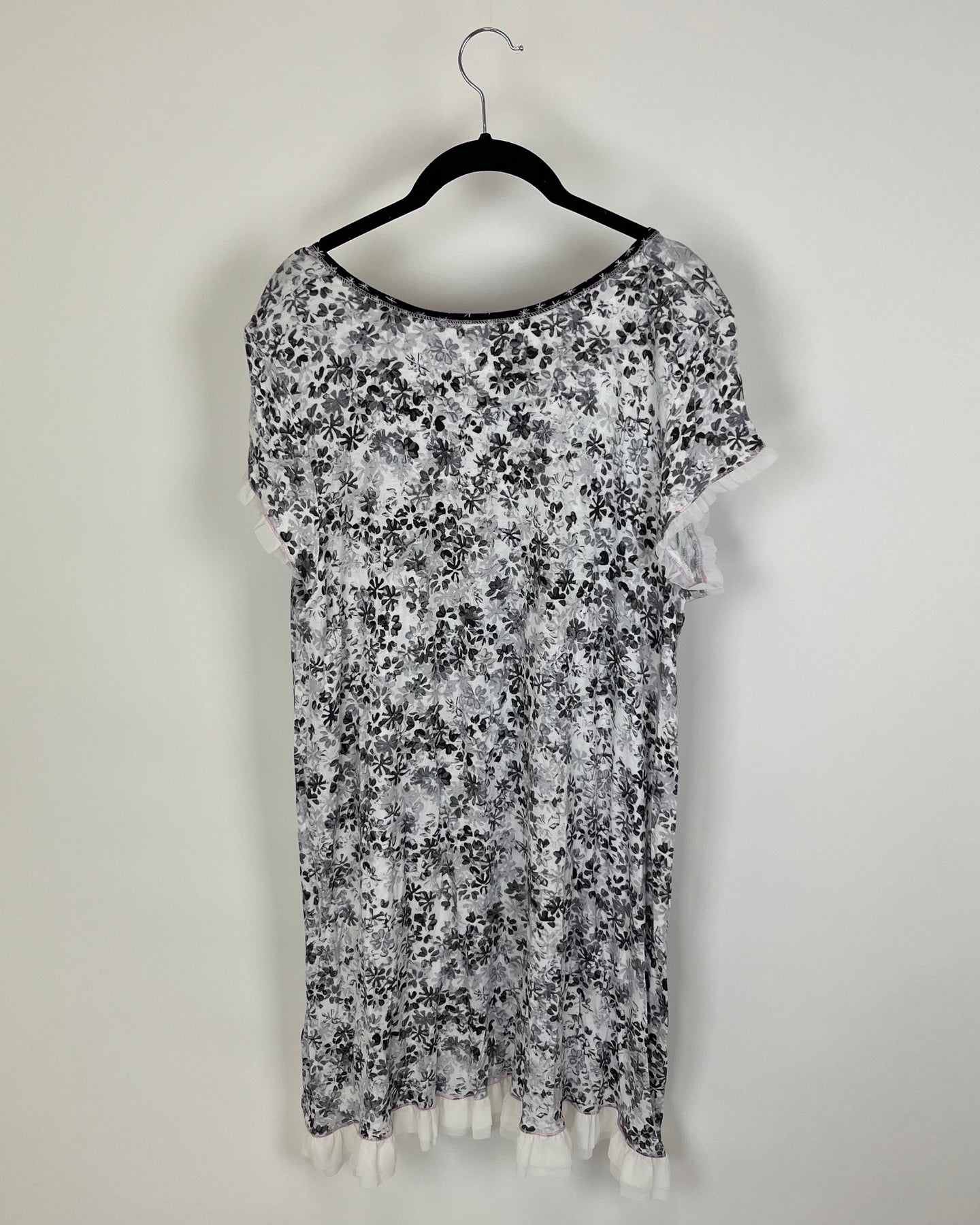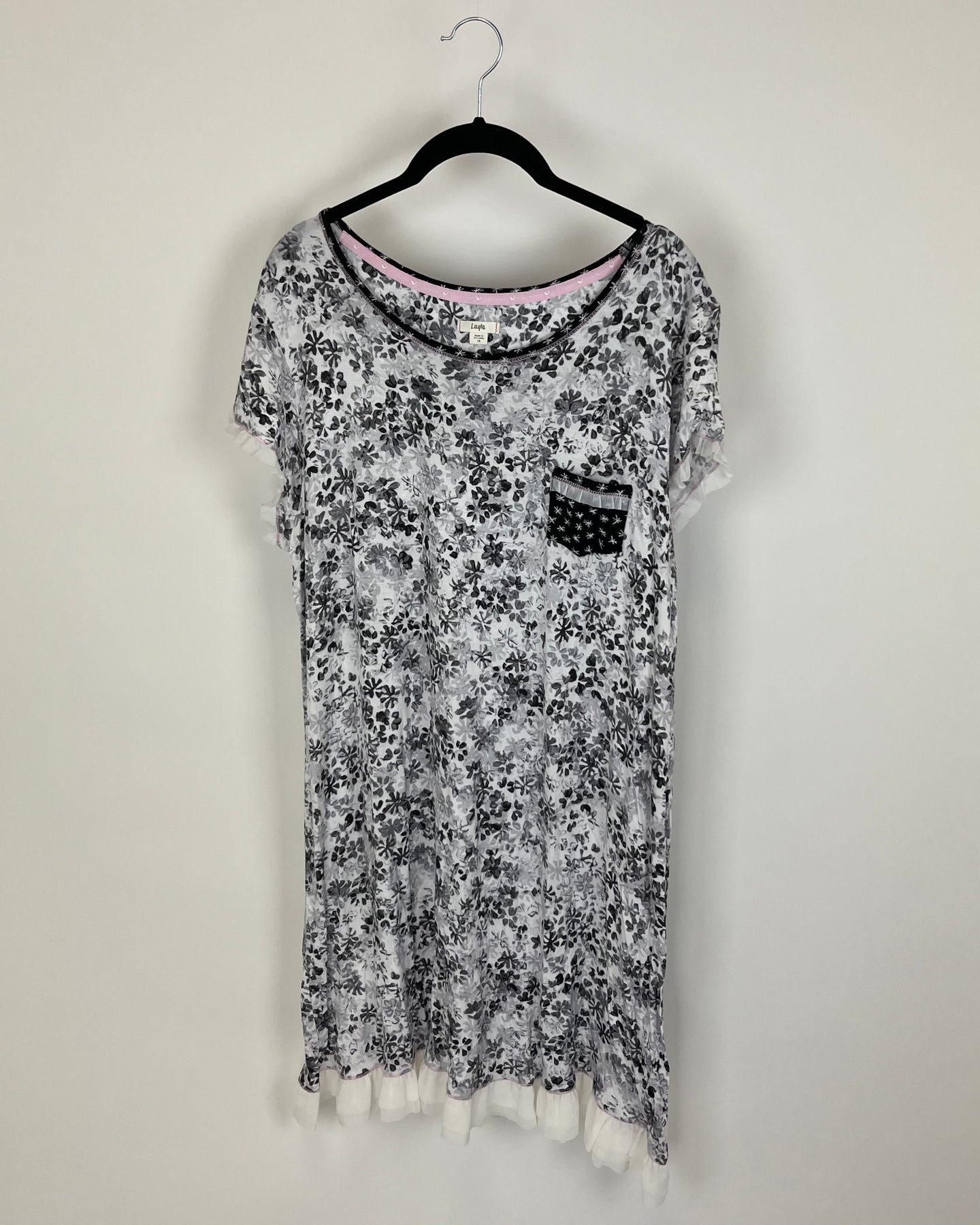 Kensie soft and stretchy grey and white floral print night gown with white mesh trim along the bottom hem and front chest pocket detailing
