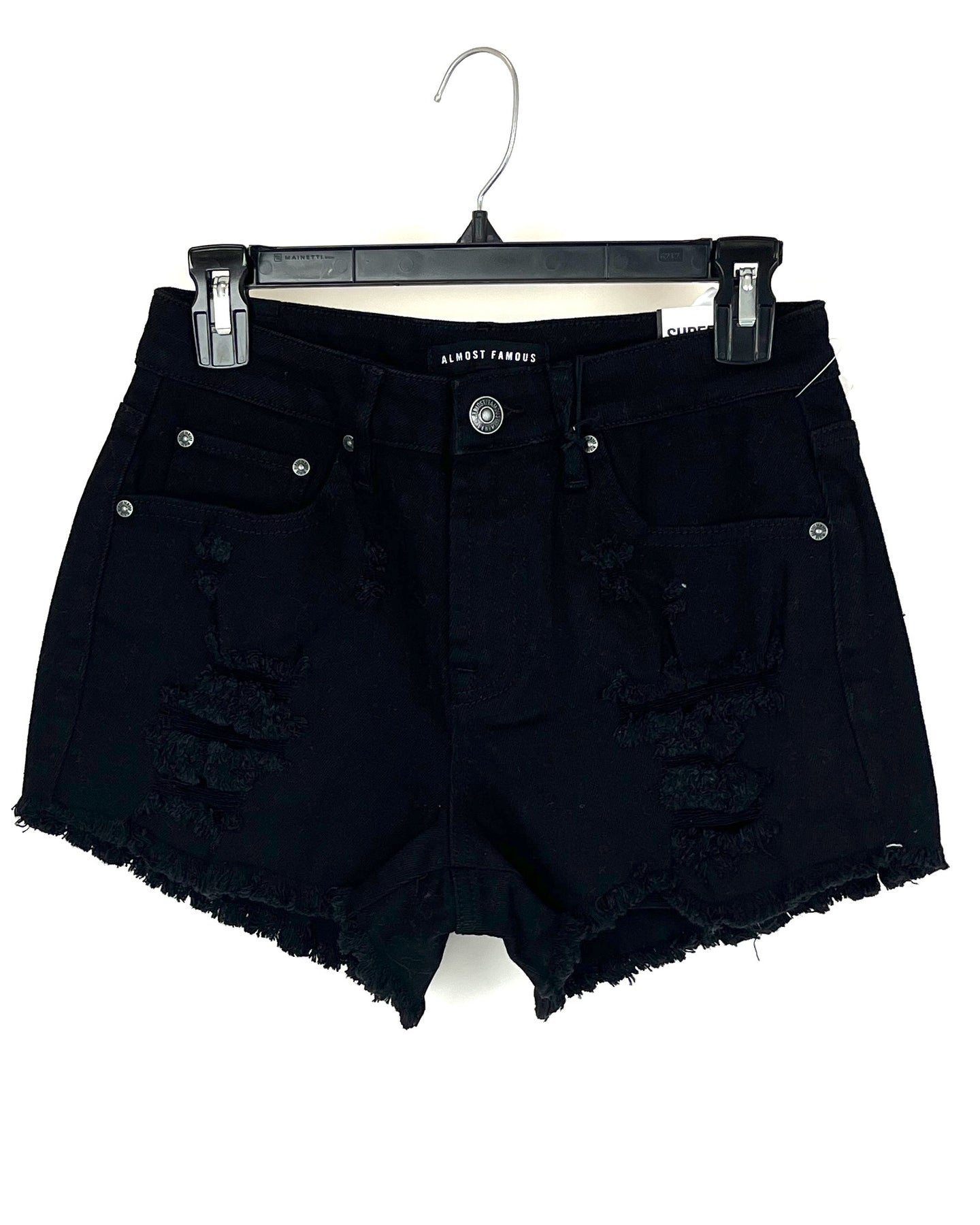 Almost Famous high rise black distressed denim shorts with zipper and button closure, two side pockets, two back pockets and distressed hem.